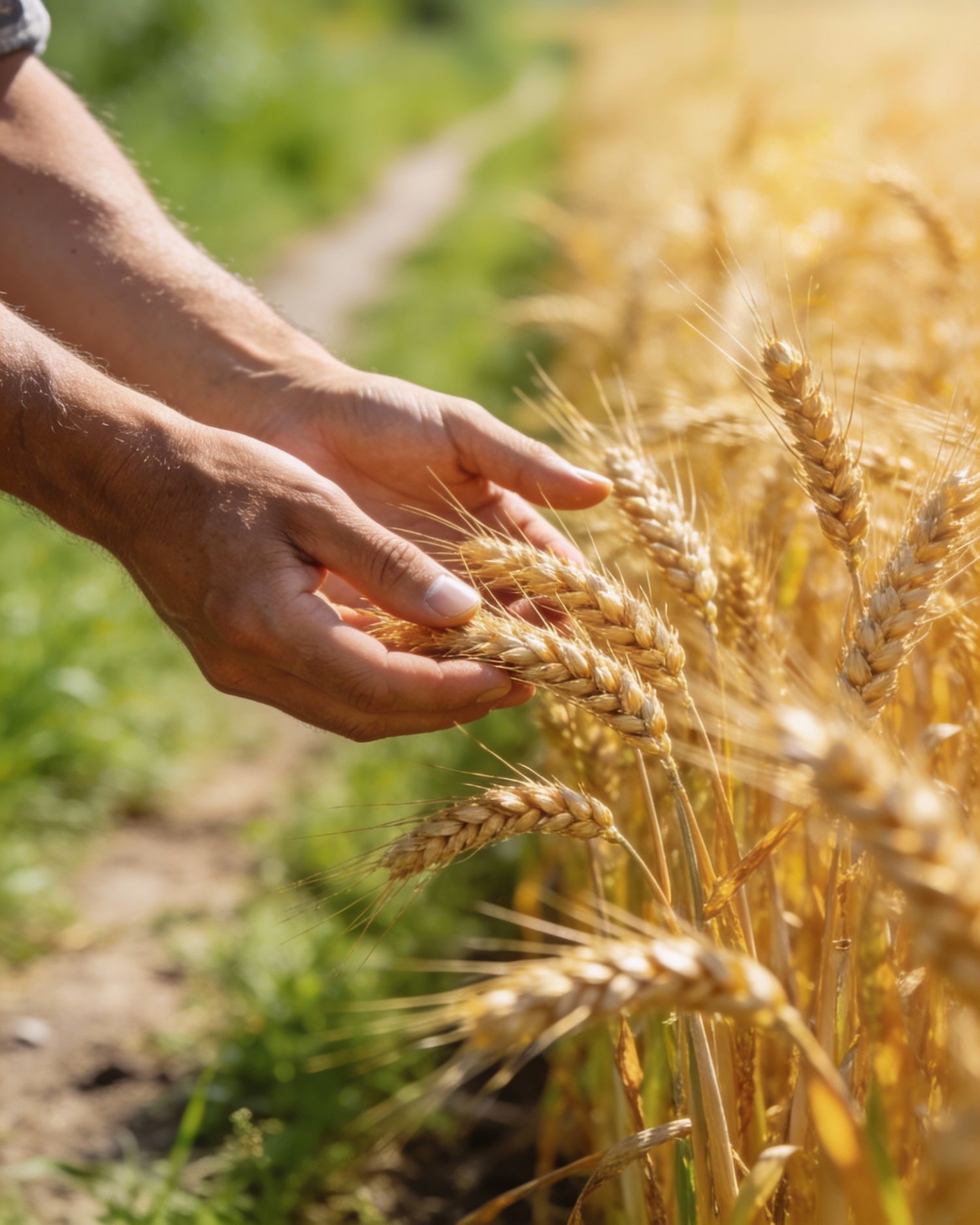 Hands gently holding golden wheat stalks in a sunlit field, showcasing the beauty of ripe crops and the connection to nature.