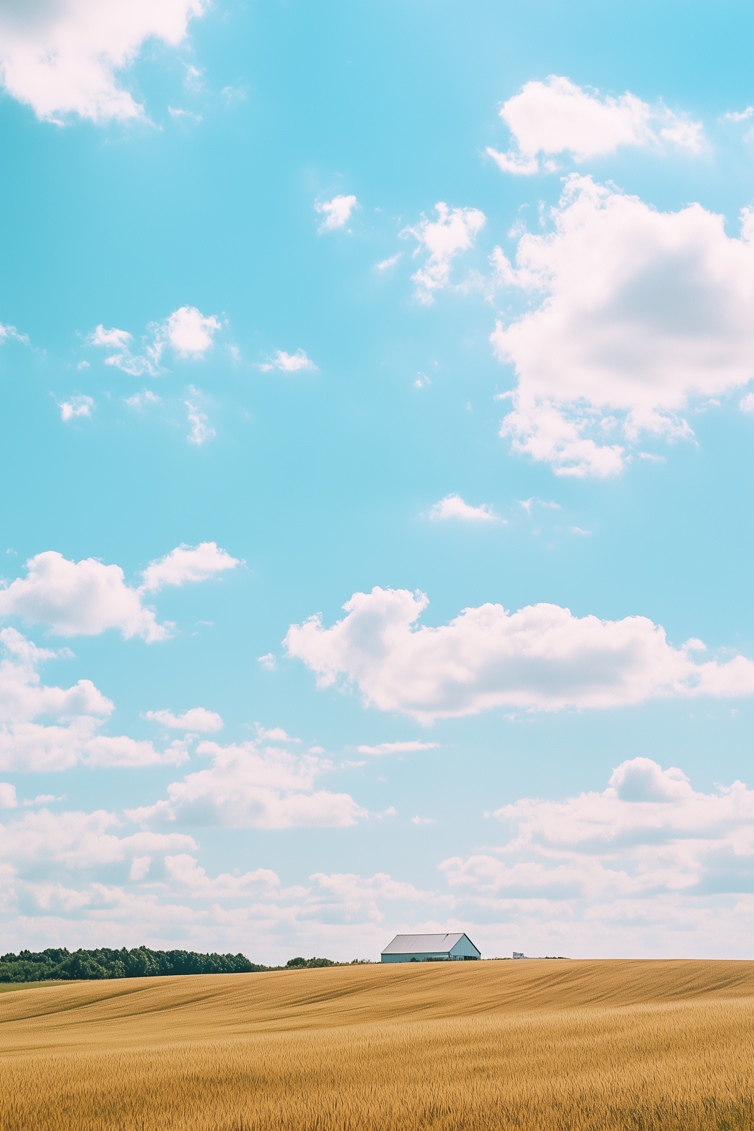 Golden wheat field under a bright blue sky with fluffy clouds, featuring a distant white barn and green tree line on the horizon.