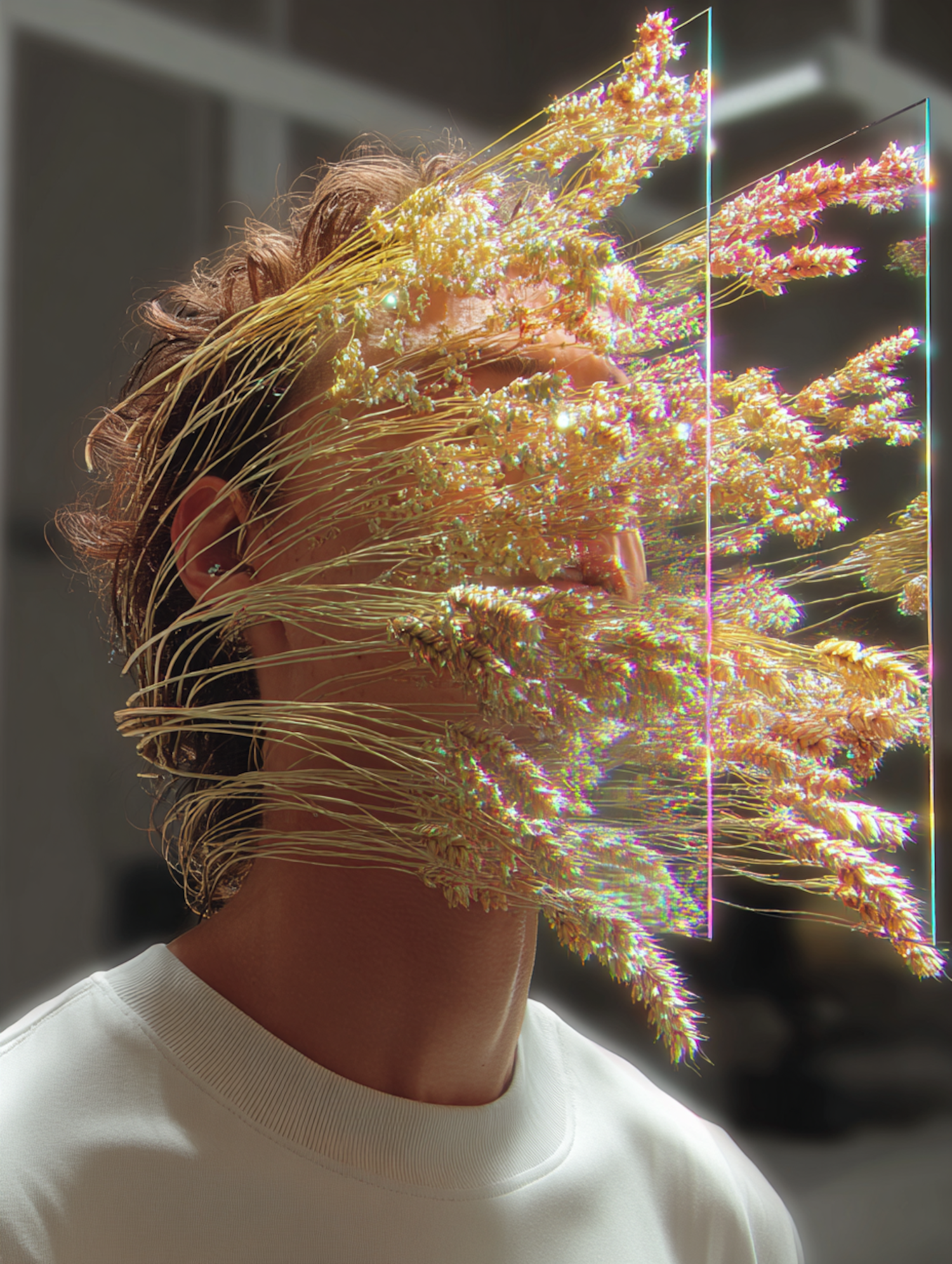 A surreal portrait of a person with their face obscured by glowing wheat stalks, creating a dreamlike and artistic visual effect.