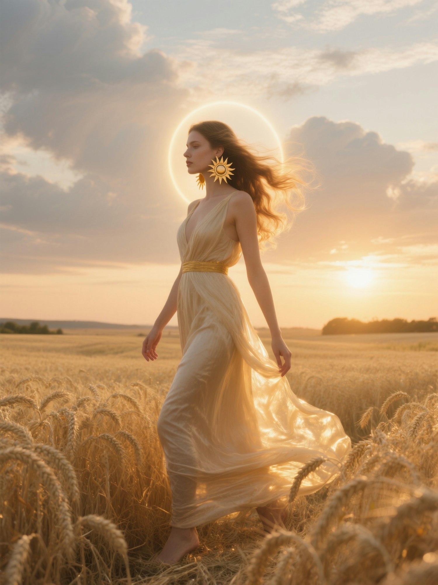 Editorial fine art photography, mythological and timeless aesthetic, golden sunlight creating a soft halo, cinematic clouds in the background, warm tones, ethereal atmosphere, ultra realistic, high resolution, full body of a woman walking through a vast golden wheat field at sunset, her gown flowing behind her like liquid light, adorned with large sculptural earrings shaped like suns, her hair catching the wind in glowing strands, composition wide and cinematic, editorial reinterpretation of Demeter, goddess of harvest.