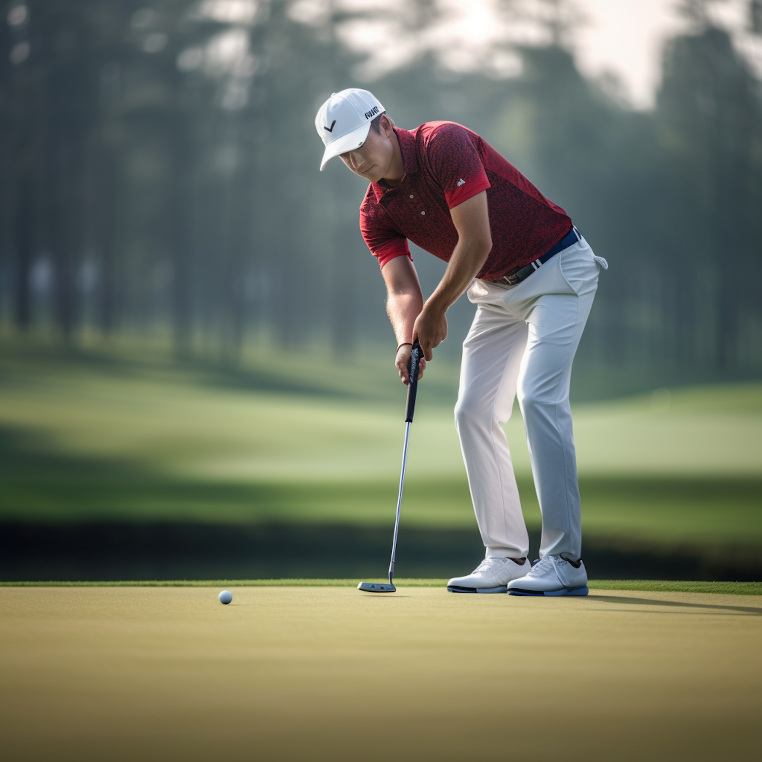 Golfer in red polo and white pants putting on a lush green course, focused and poised under sunny skies.