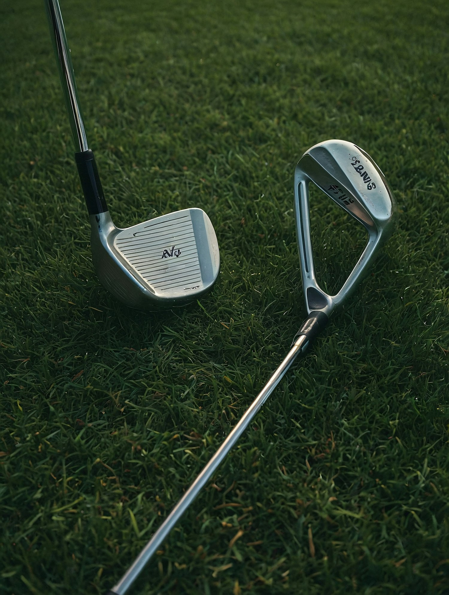 Close-up of two sleek golf clubs resting on vibrant green grass, highlighting their polished metal finishes and intricate designs.