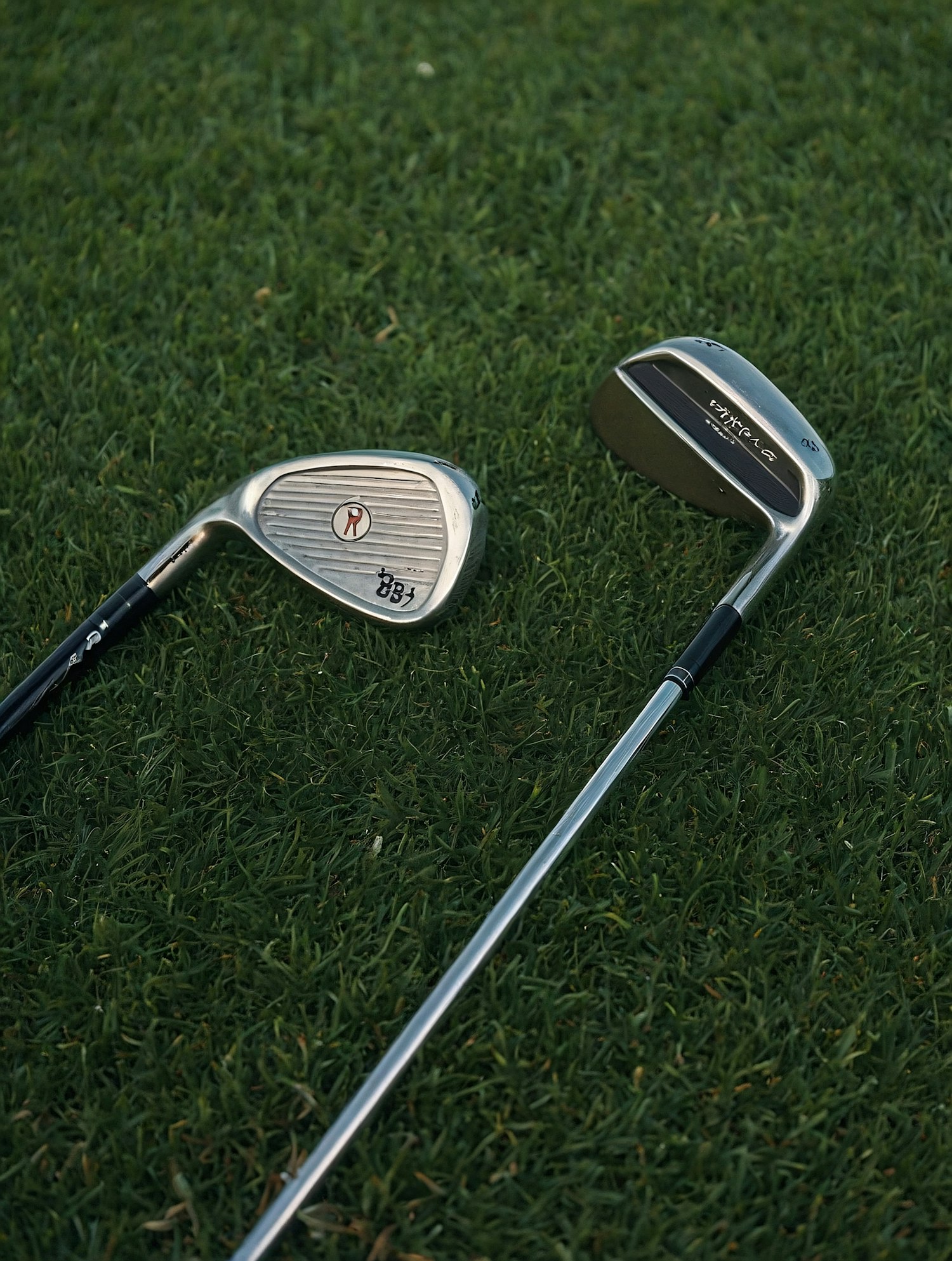Two sleek golf clubs resting on vibrant green grass, showcasing their metallic finishes and detailed engravings.