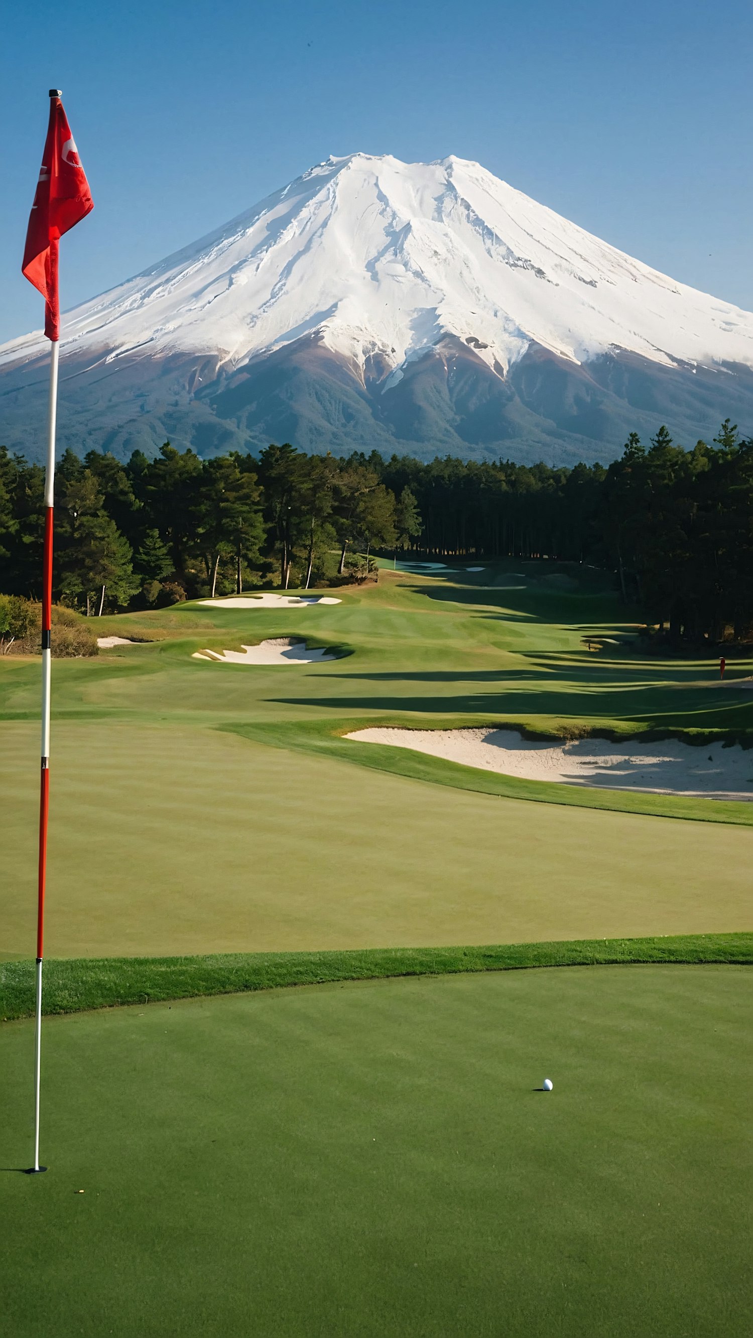 Stunning golf course with Mount Fuji in the background, featuring a green, sand bunkers, and a red flagpole under a clear blue sky.