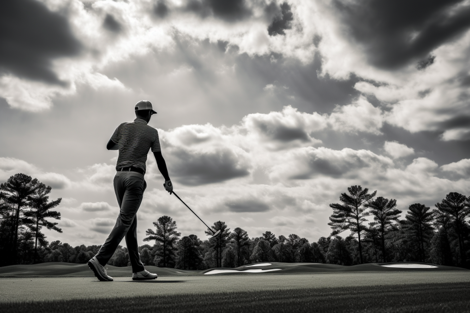 Black and white image of a golfer on a lush course, dramatic clouds overhead, creating a serene and timeless atmosphere.