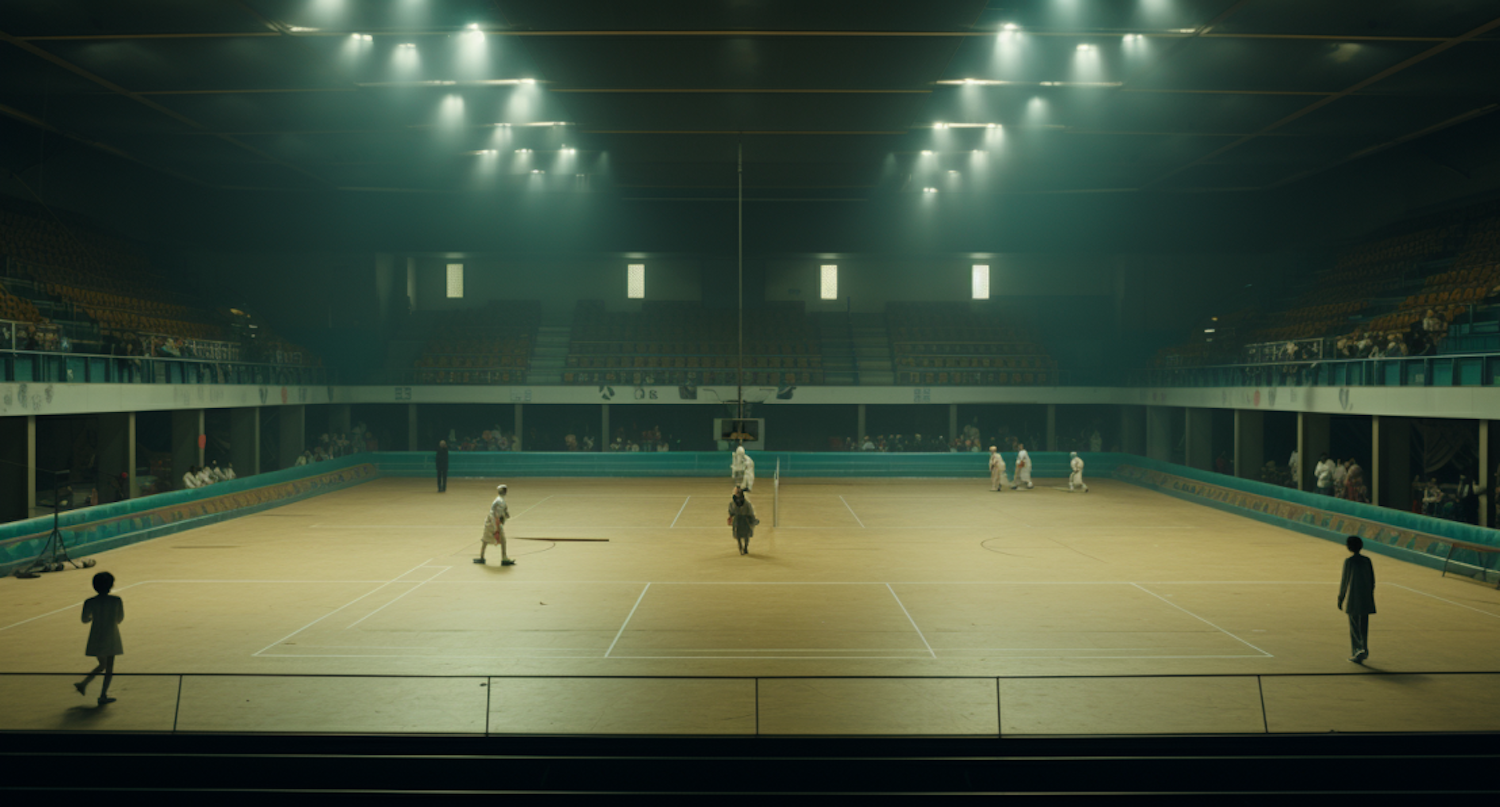 Spacious indoor sports arena with wooden floor, dim lighting, and scattered people, suggesting a calm practice session.