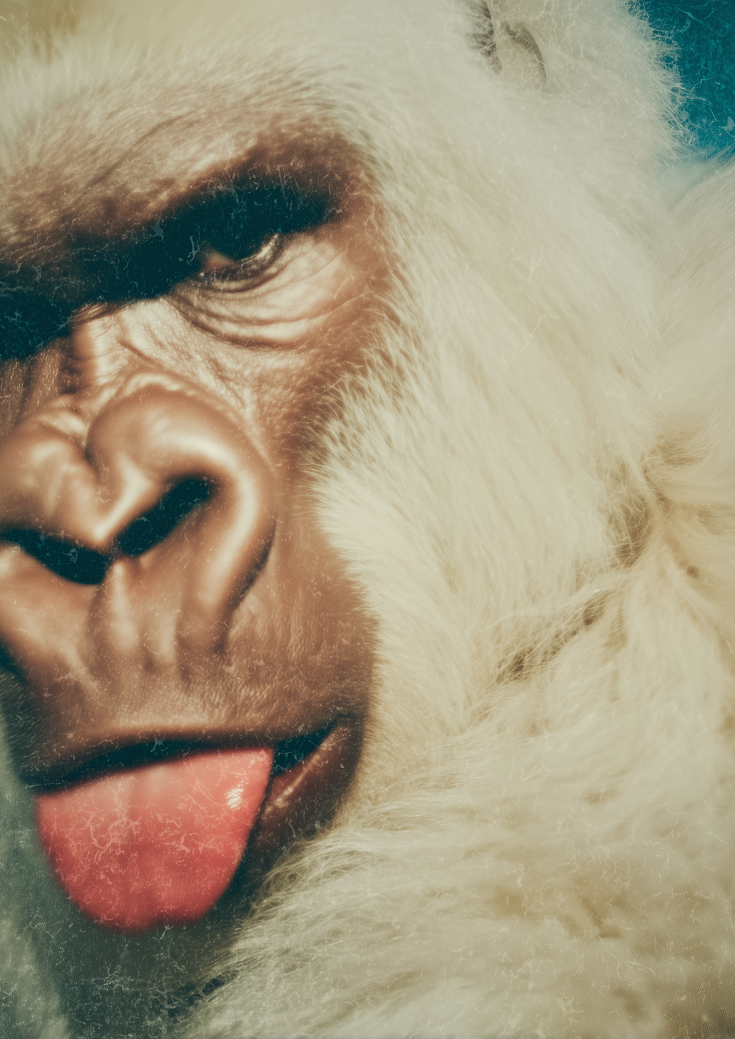 A close-up of a gorilla's face with tongue out playfully. Its fur texture and vibrant expression make for an engaging capture.