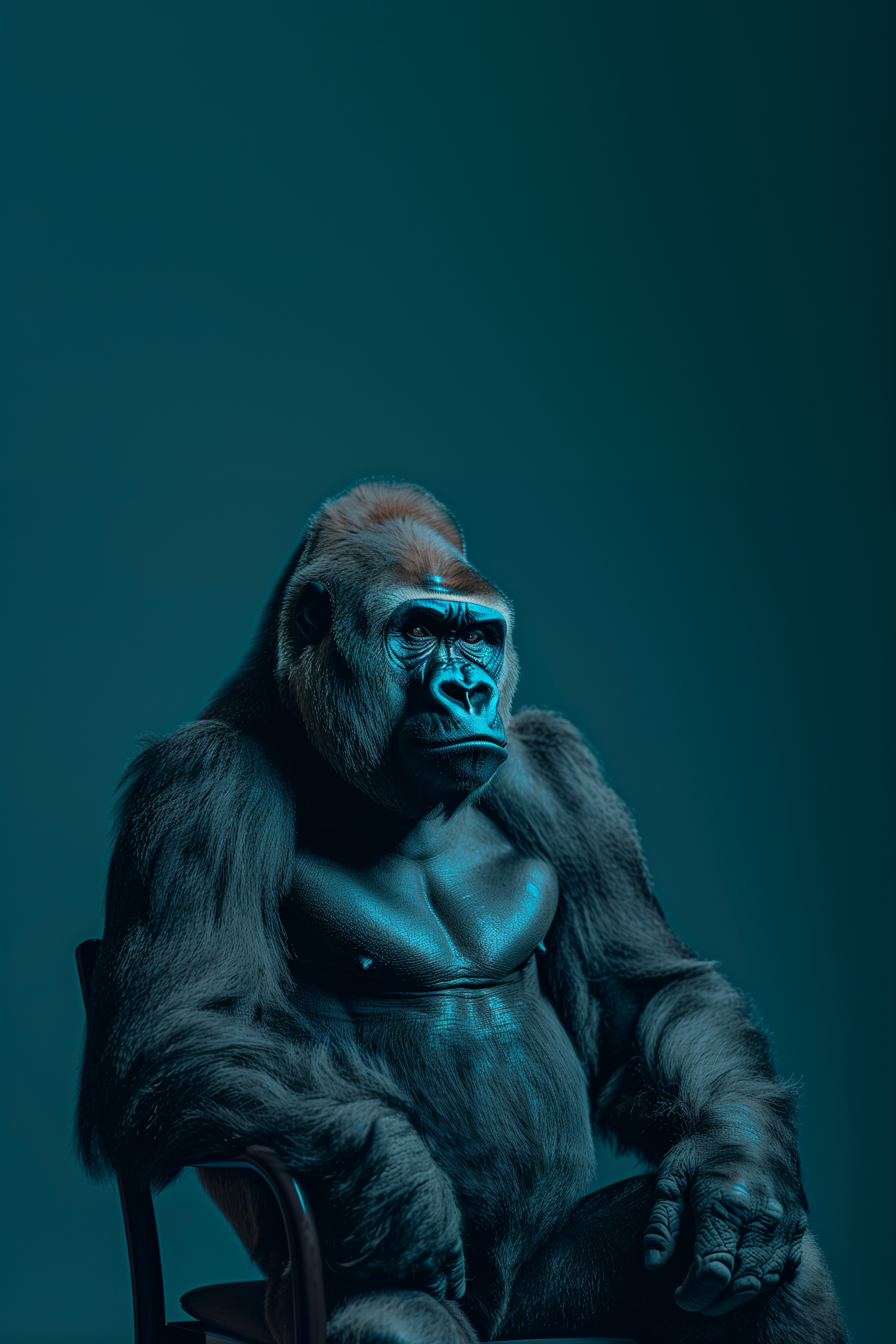 A contemplative gorilla sits in a chair against a teal background, exuding calm and authority. Cool lighting highlights its muscular form.