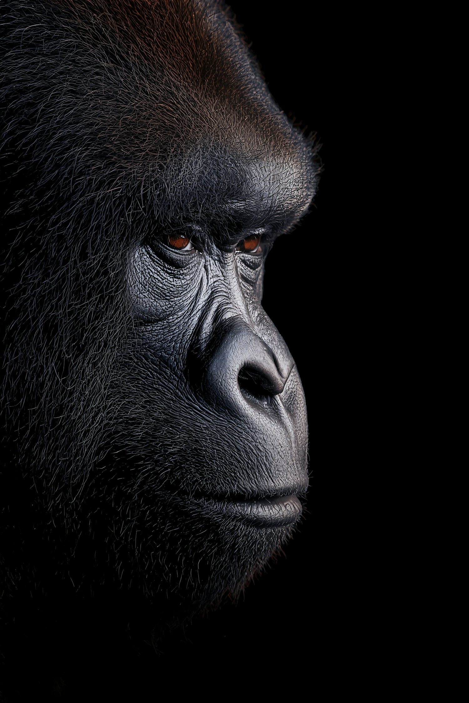 Close-up of a gorilla's face with detailed textures and expressive eyes, set against a black background for a dramatic effect.