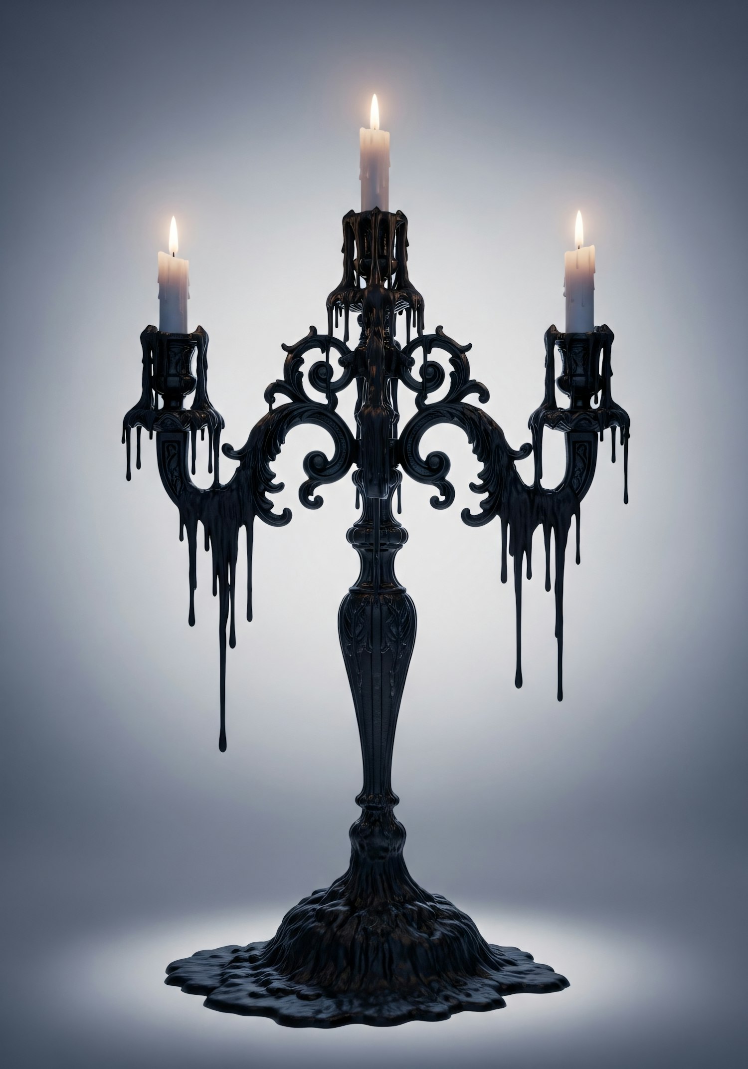 A gothic candelabra with ornate details and dripping wax, holding three lit candles, set against a softly lit background.