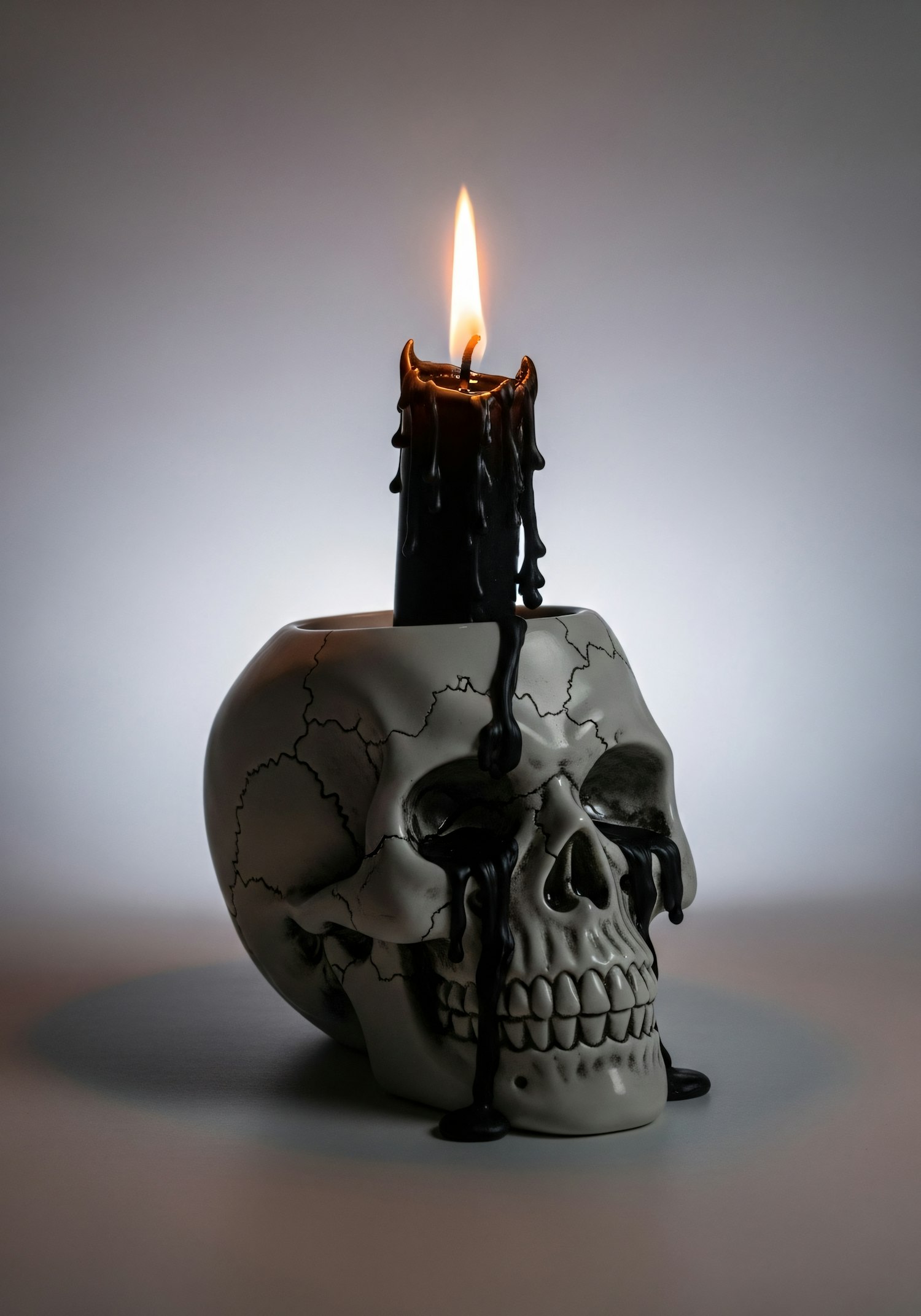 A lit black candle atop a ceramic skull with dripping wax, creating a gothic and eerie aesthetic against a neutral background.