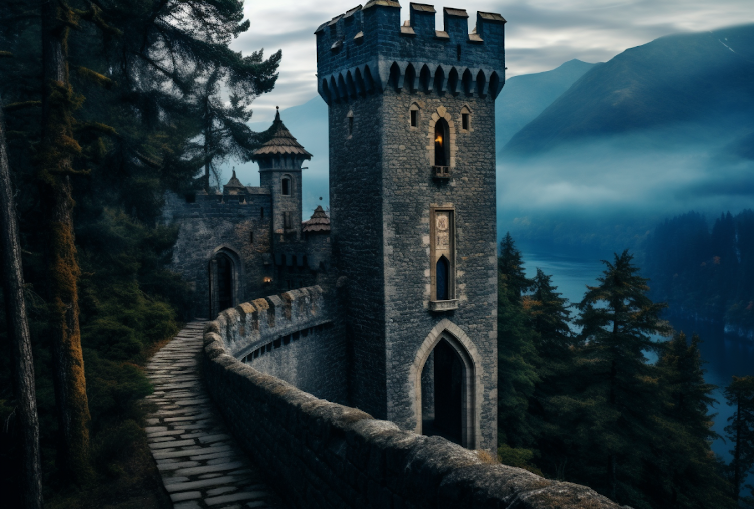 Majestic medieval castle with a tall tower, surrounded by misty forests and a serene lake, creating a mystical and ancient ambiance.