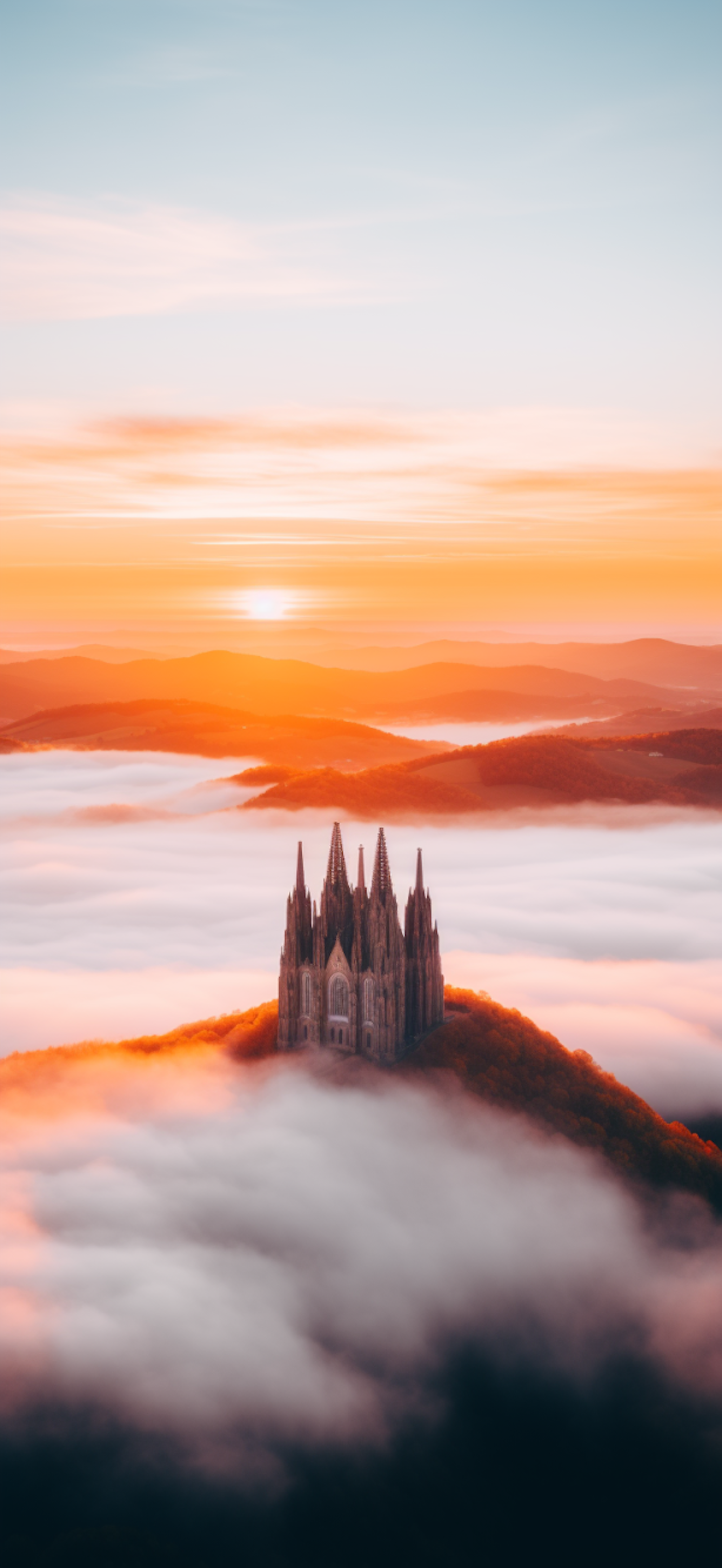 Gothic cathedral rises above clouds at sunrise, surrounded by rolling hills and vibrant sky, creating a serene and ethereal scene.