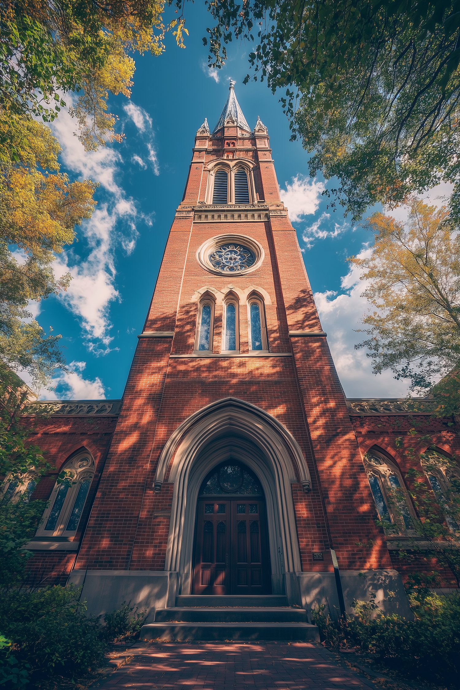 Majestic brick church with Gothic spire and stained glass, framed by trees under a clear blue sky.