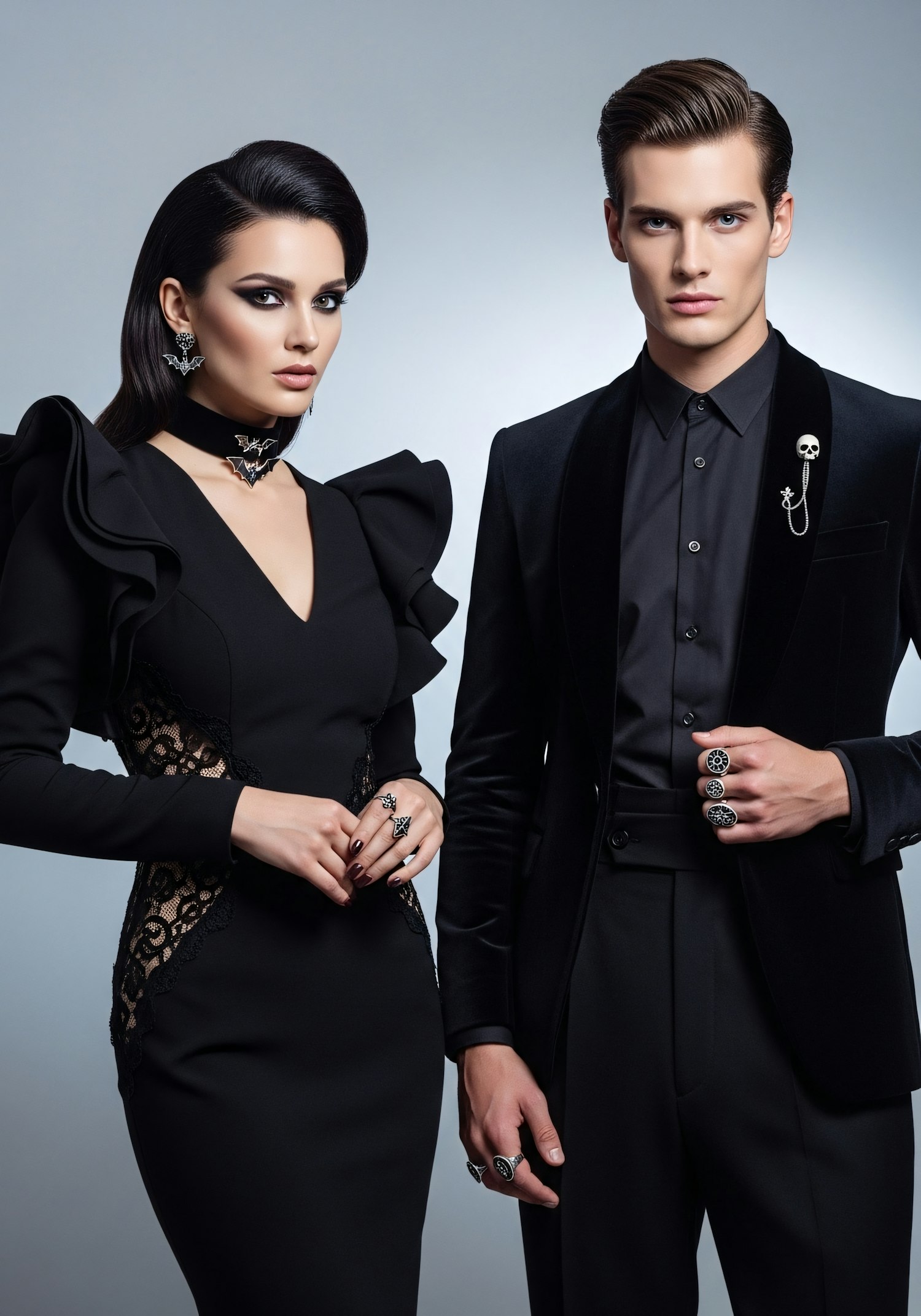 A stylish duo in black attire, featuring gothic-inspired accessories and elegant details, perfect for a dramatic and sophisticated look.