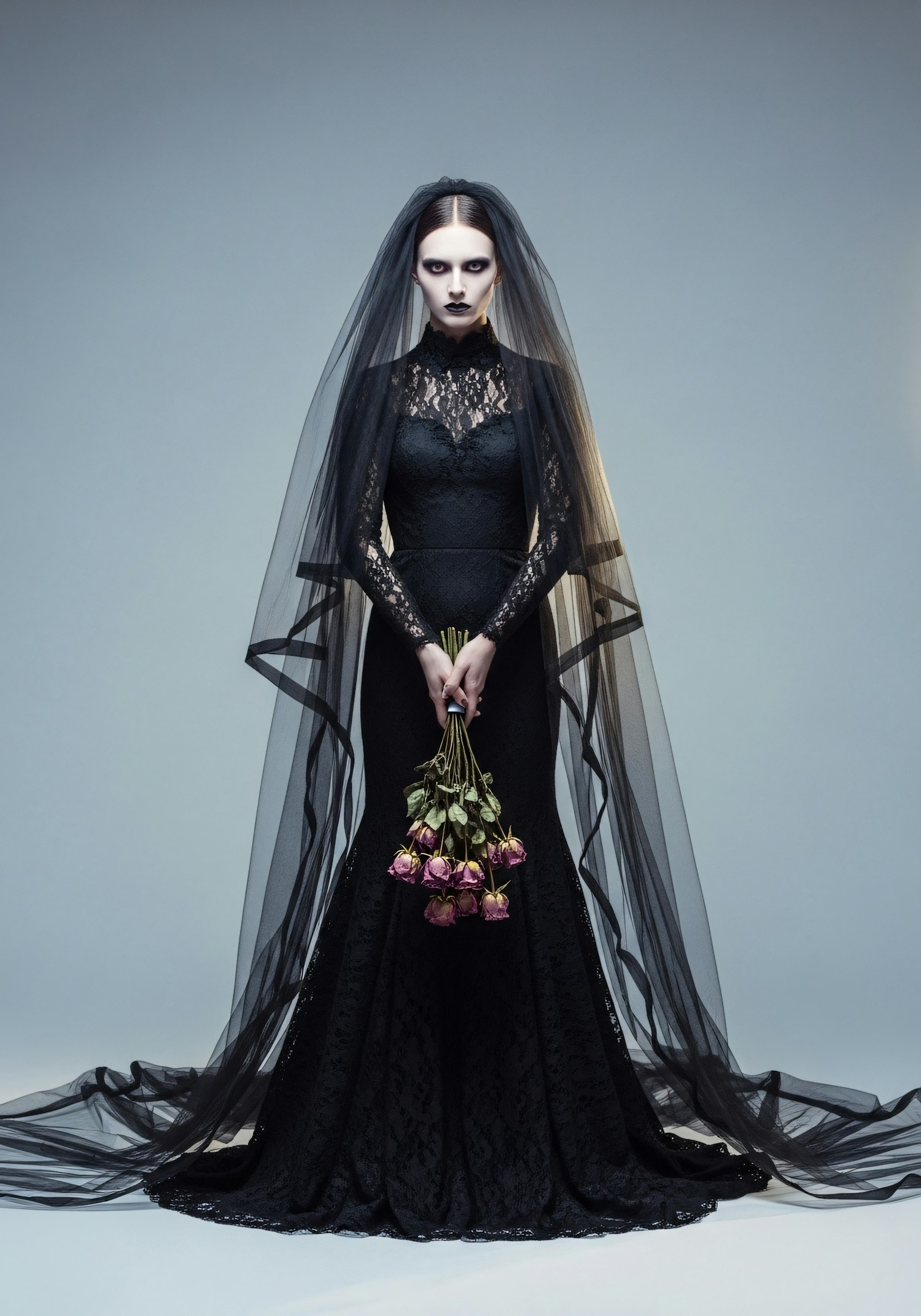 A woman in a black lace dress and veil holds wilted pink roses, creating a dramatic and gothic aesthetic against a neutral background.