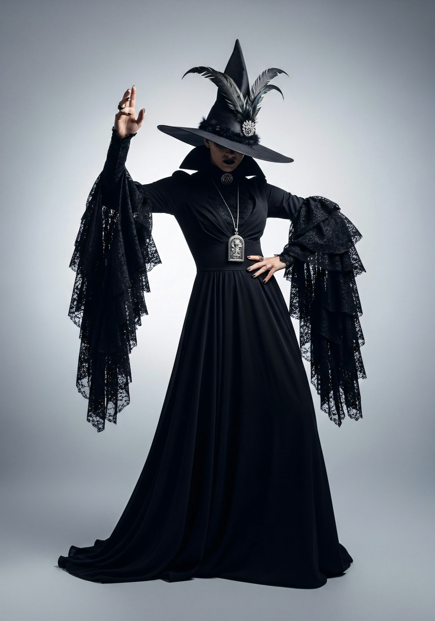 A person in a dramatic black outfit with a wide-brimmed hat and lace details, exuding a gothic and mysterious aesthetic.