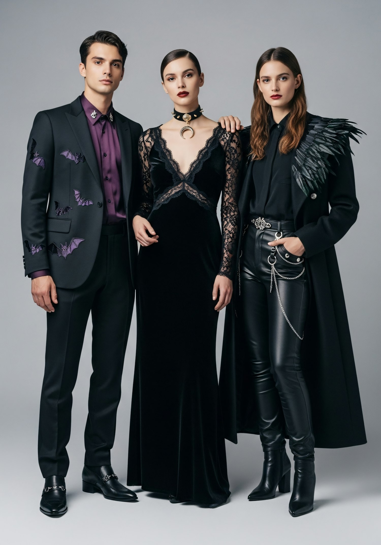 Three individuals in gothic-inspired fashion, featuring black and purple tones, lace, leather, and unique accessories, standing confidently.
