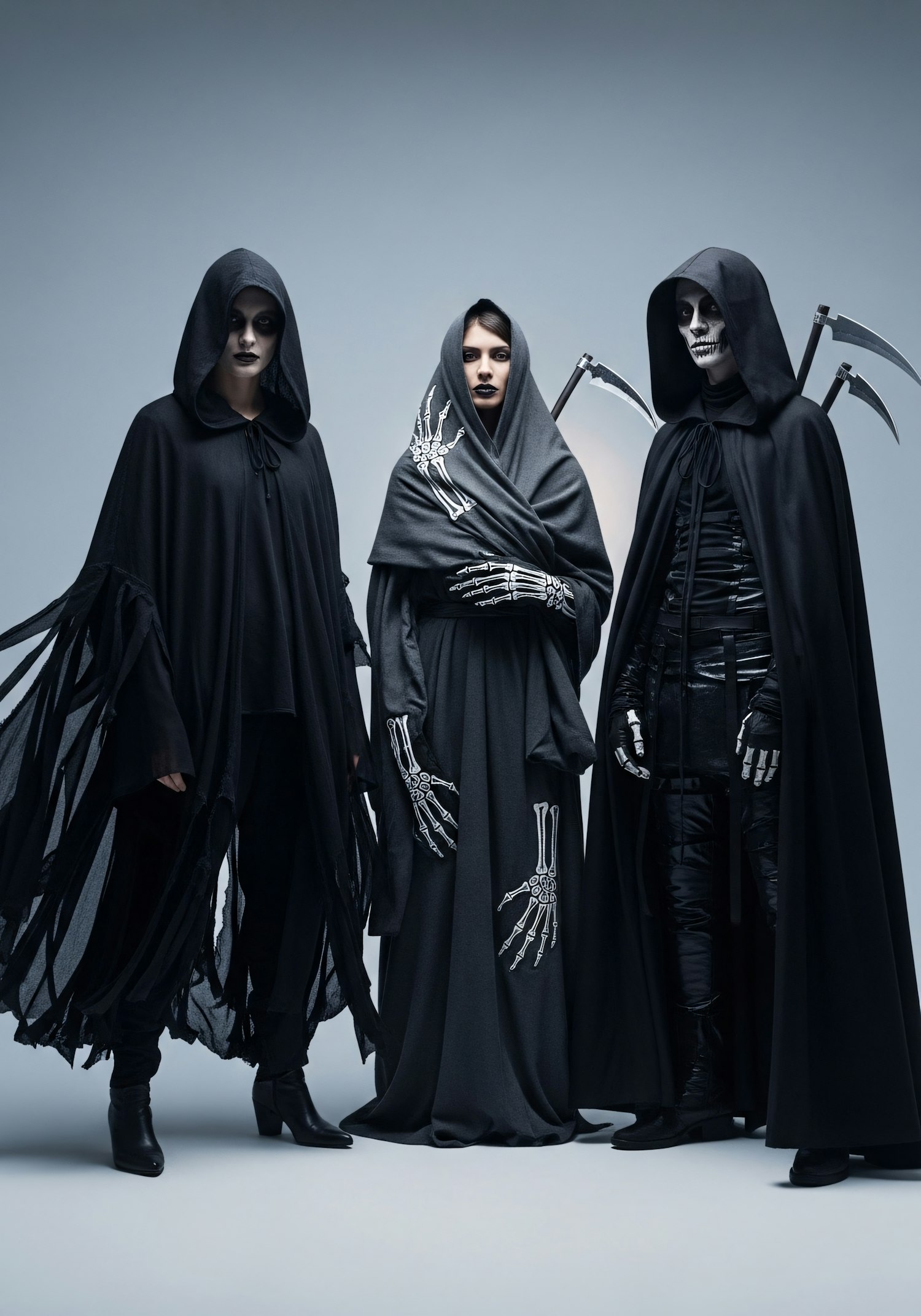 Three individuals in gothic costumes with skeletal motifs and scythes, creating a dramatic and eerie visual.