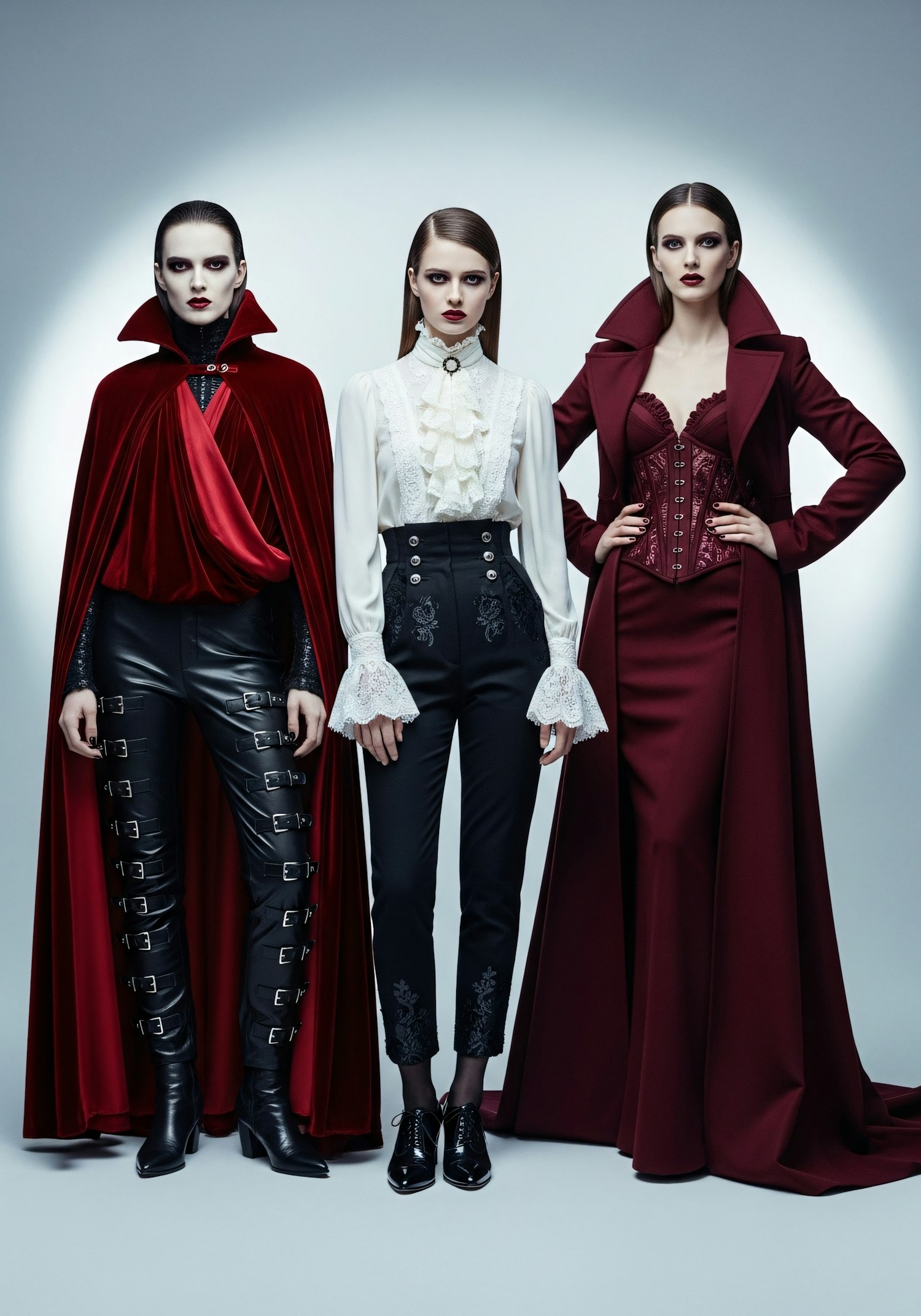 Three individuals in gothic-inspired fashion, featuring velvet capes, lace blouses, and corset tops, set against a neutral background.