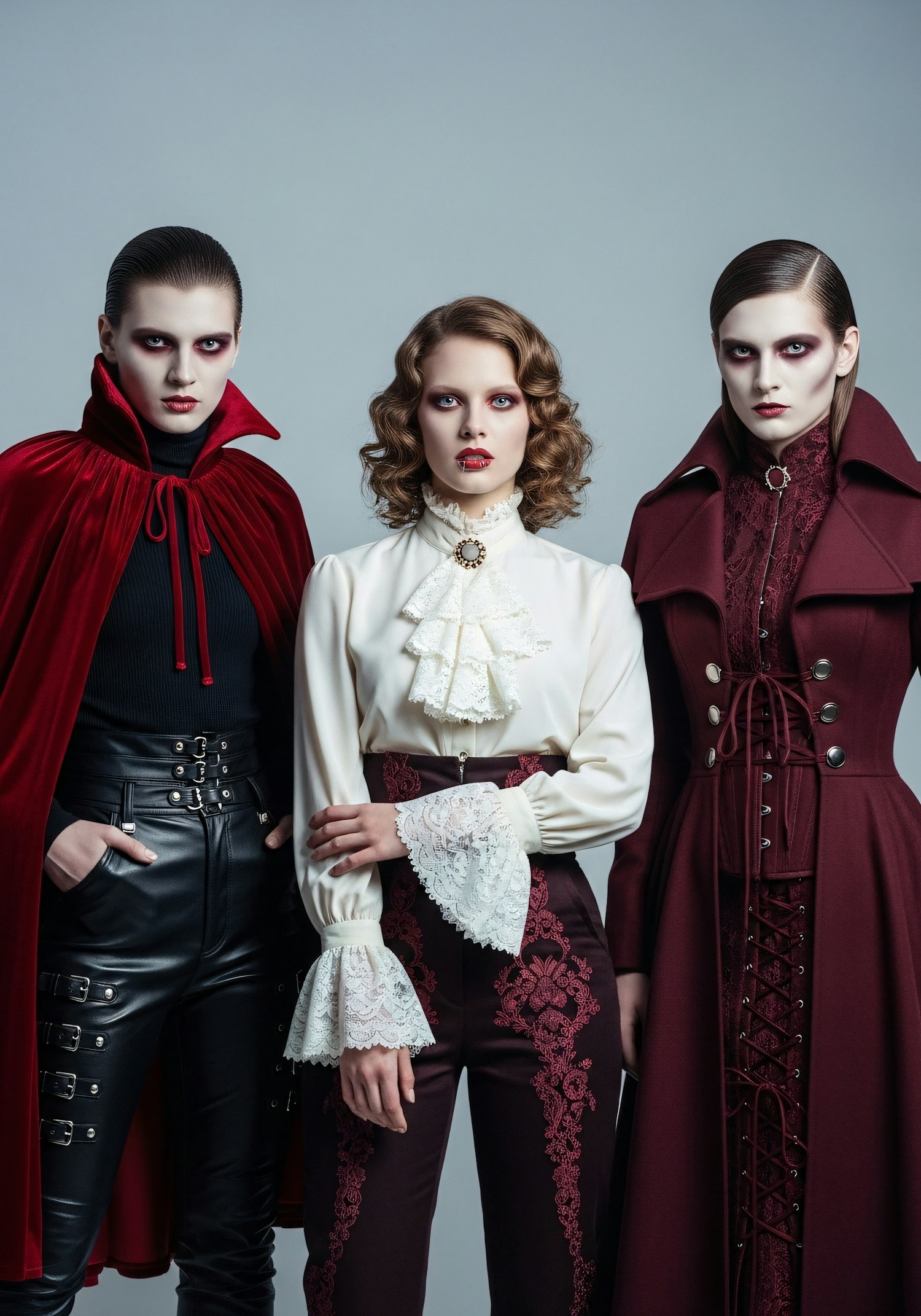Three individuals in gothic-inspired attire, featuring intricate lace and embroidery, dramatic makeup, and a cohesive dark aesthetic.