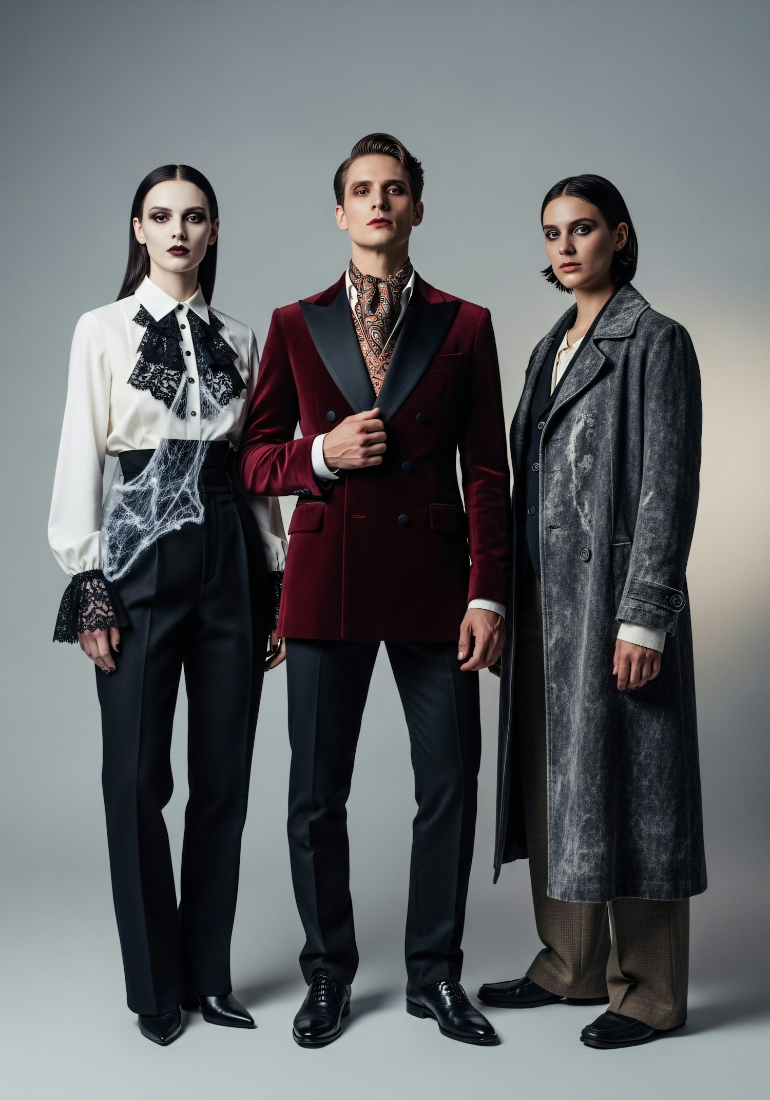 Three individuals in gothic-inspired formal attire, featuring intricate details and dramatic textures, set against a neutral background.