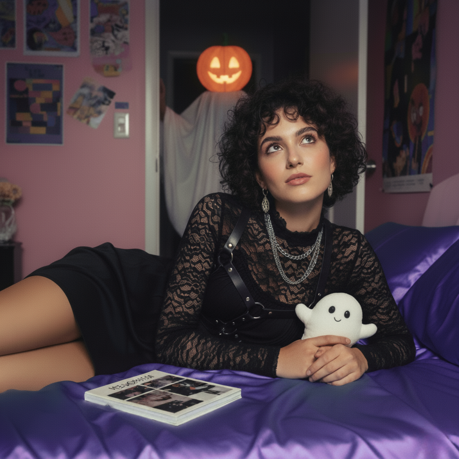 A young woman in a gothic outfit reclines on a bed, holding a plush ghost, with Halloween decor and a playful spooky figure in the background.