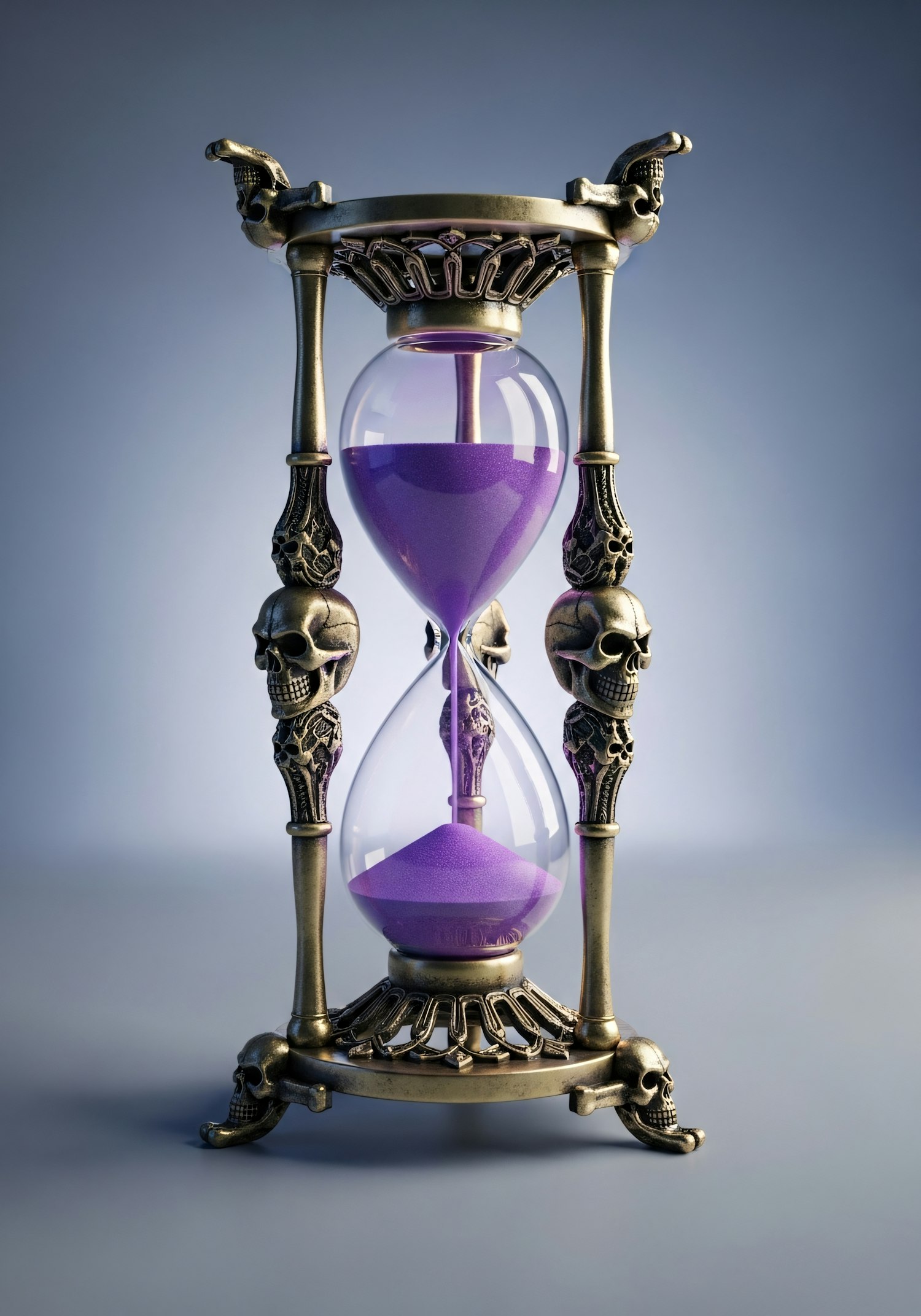 A gothic-style hourglass with a metallic skull-adorned frame and vibrant purple sand, set against a soft blue gradient background.