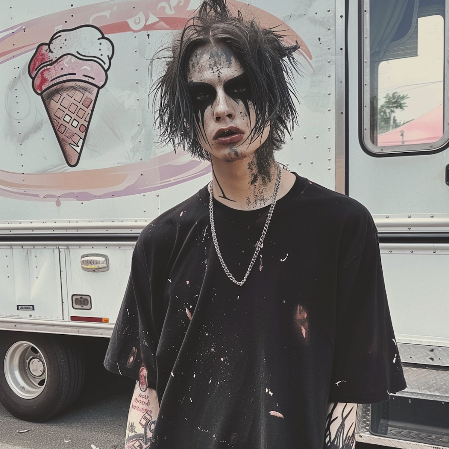 Young man with gothic makeup and tattoos stands in front of an ice cream truck, wearing a black t-shirt and silver chain.