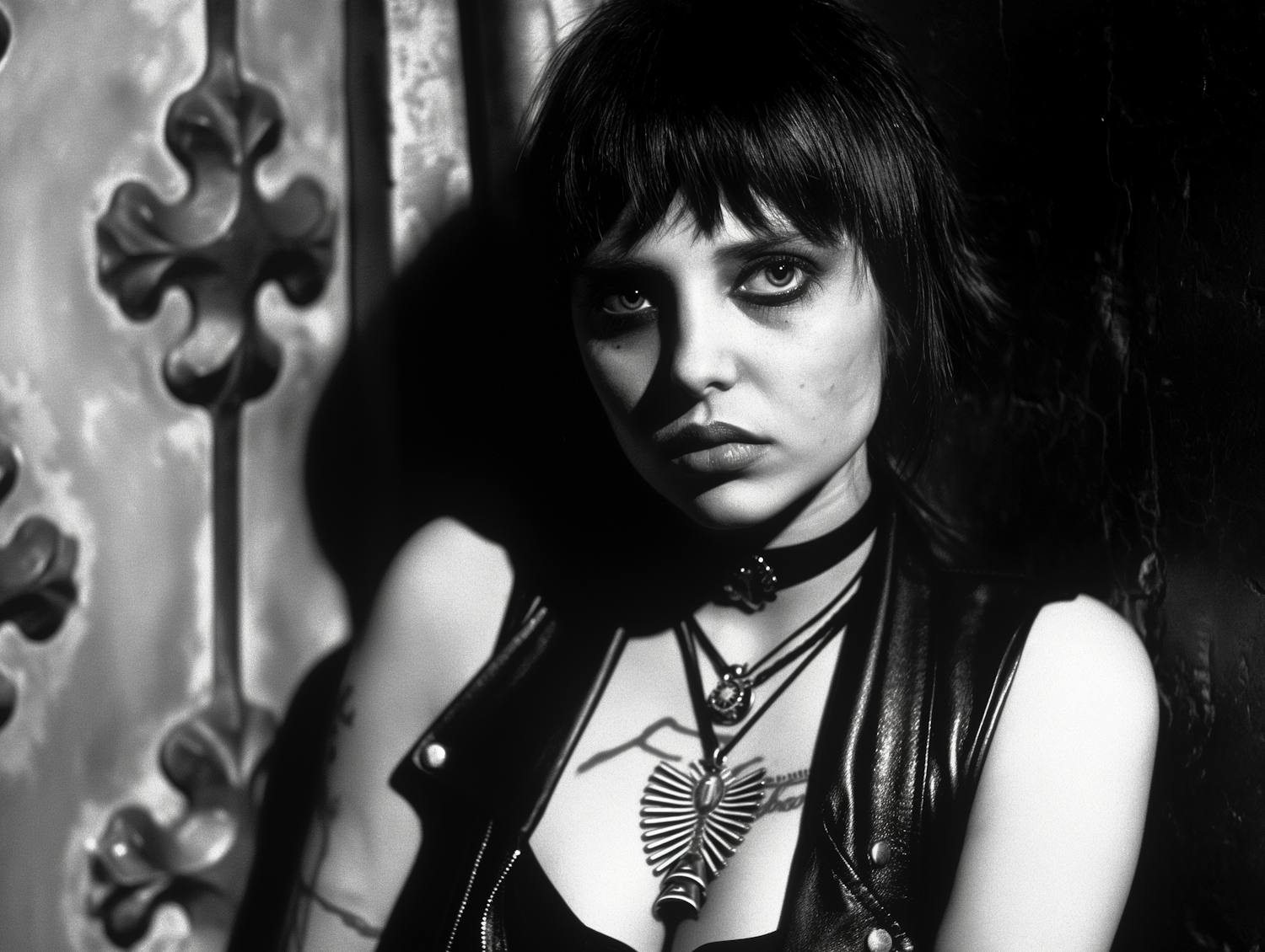 Young woman with dark hair and leather vest, wearing bold jewelry, stands against an ornate background with dramatic lighting.