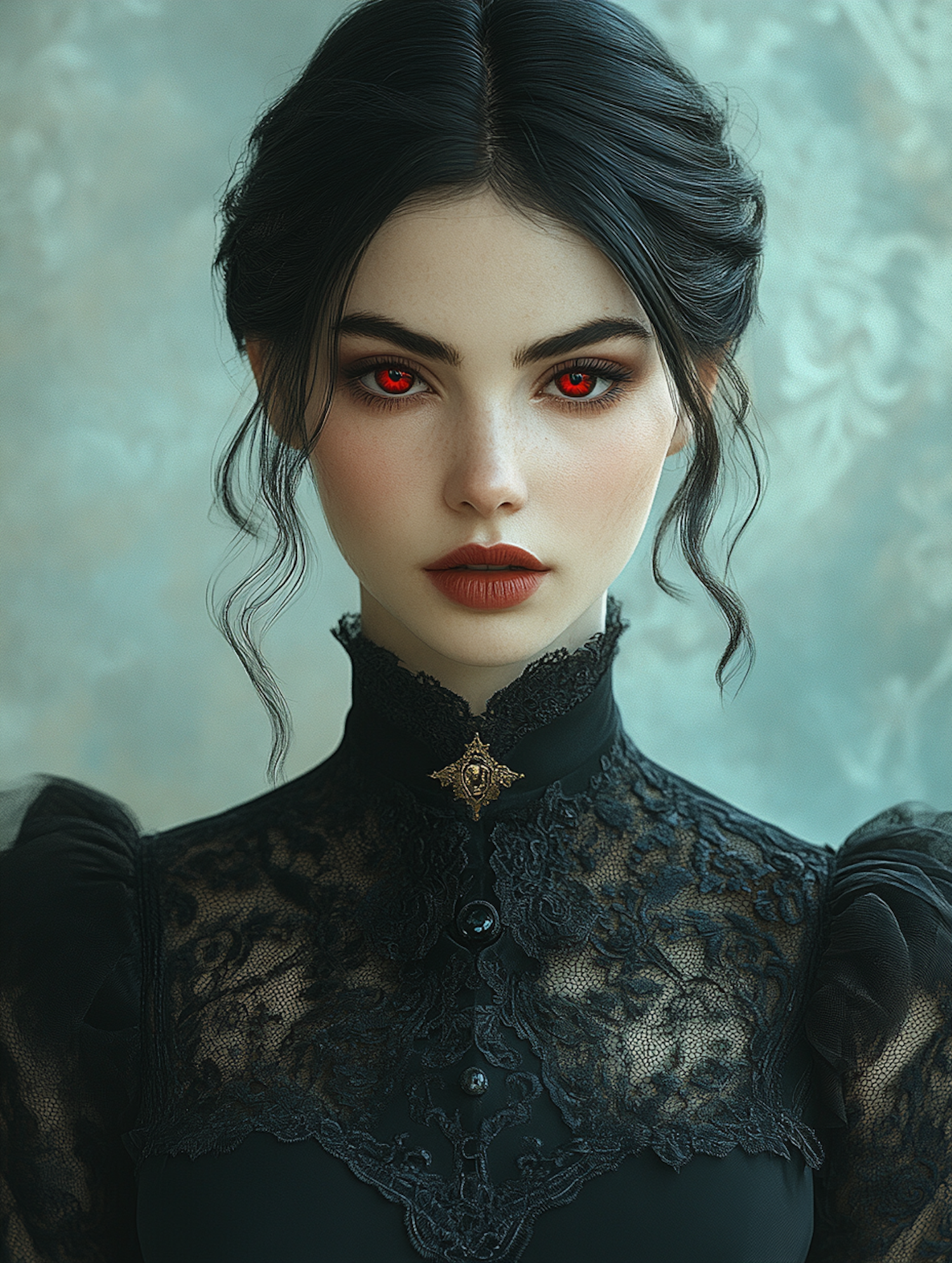 Gothic woman with red eyes and black lace dress, exuding mystery and elegance against a muted green background.