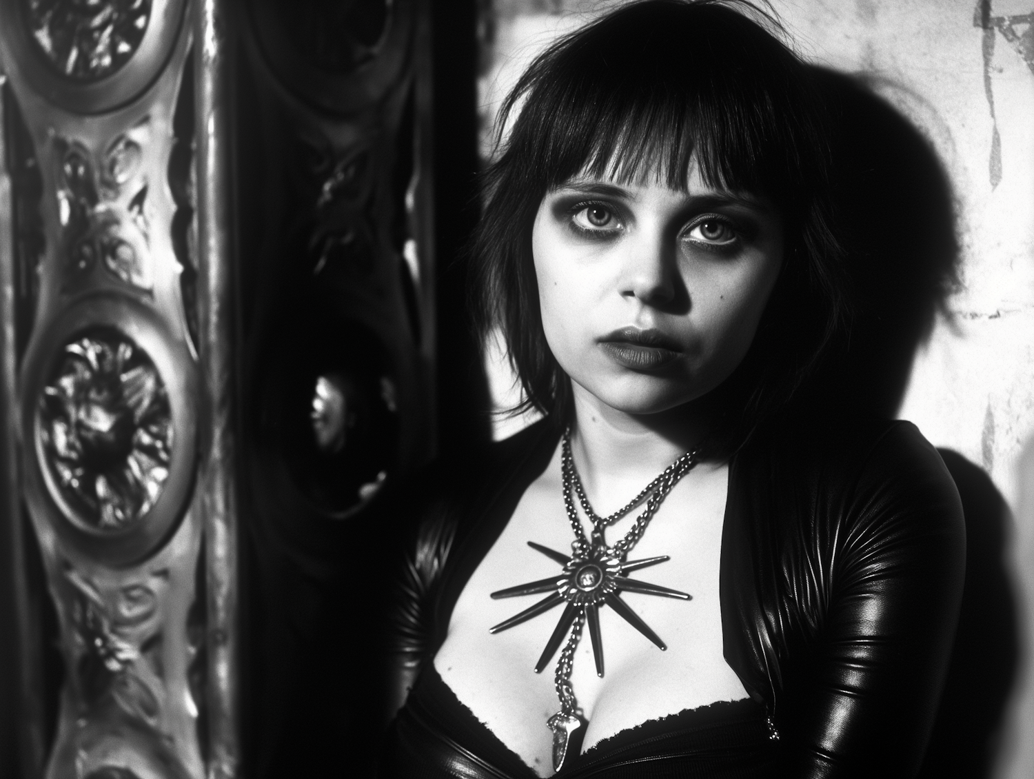 Black-and-white portrait of a gothic woman with bold makeup, spiked necklace, and leather outfit against an ornate, textured background.