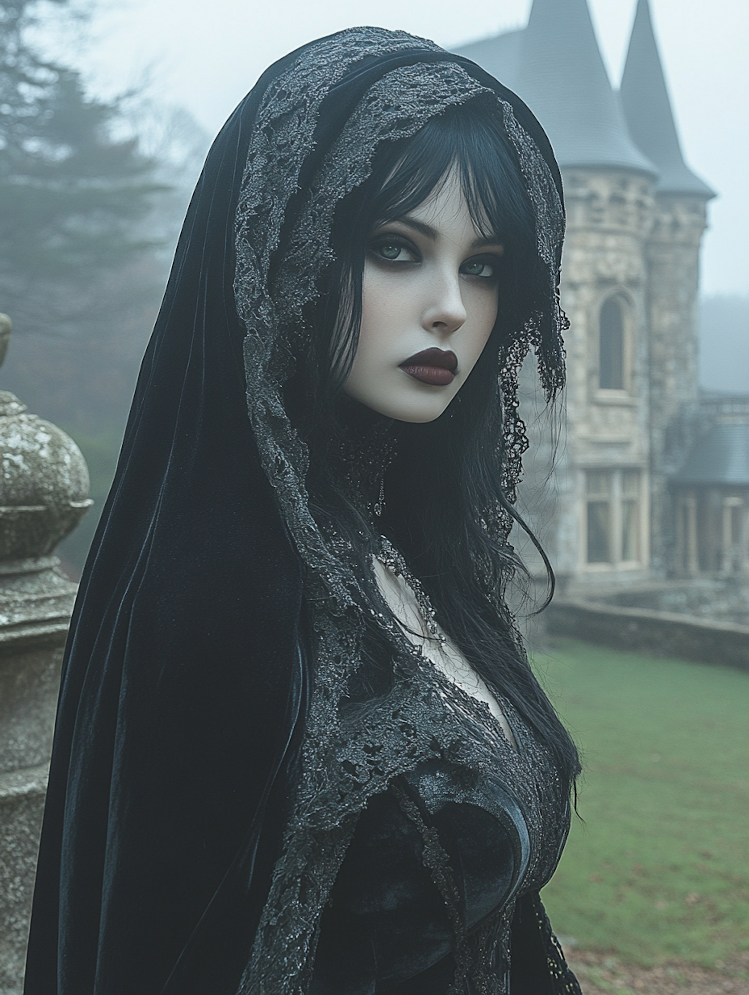 Gothic woman in black velvet cloak stands before a misty castle, exuding mystery and elegance with dramatic makeup and intricate lace.
