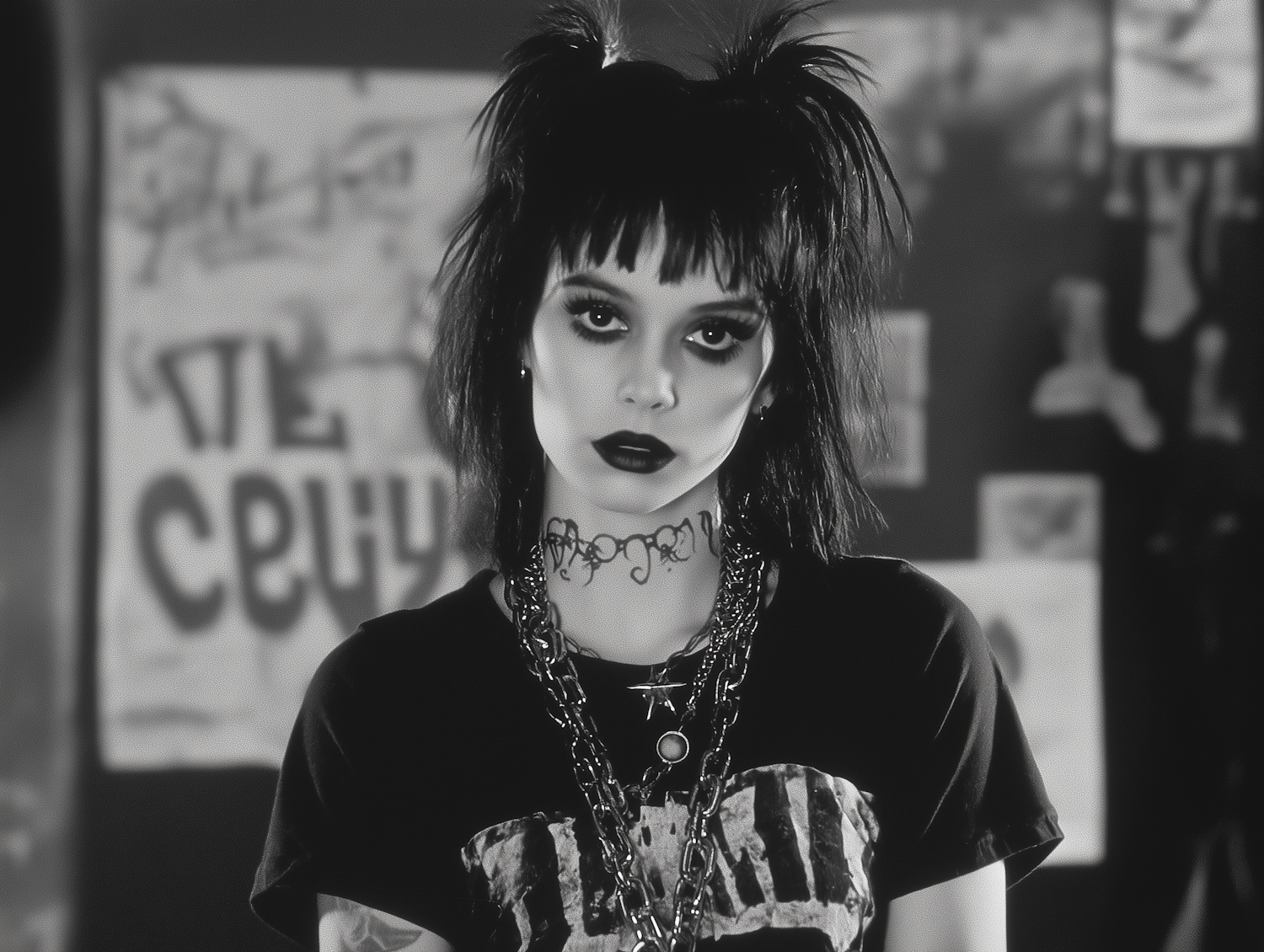 Gothic woman with spiky hair, dark makeup, and chains, exuding a bold and edgy style against a blurred background.
