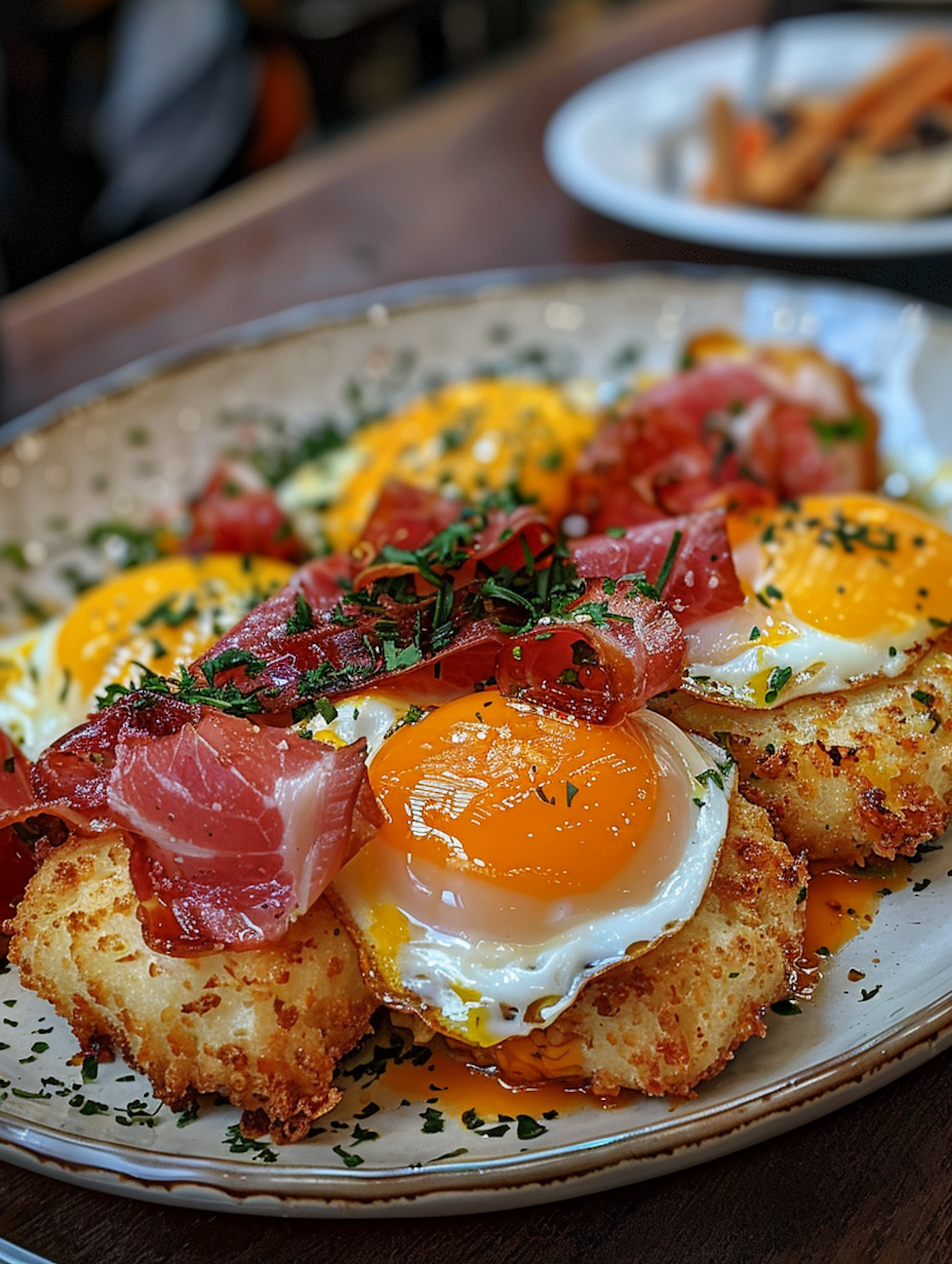 Delicious breakfast with crispy fried eggs, golden hash browns, and savory cured ham, garnished with fresh herbs on a rustic plate.