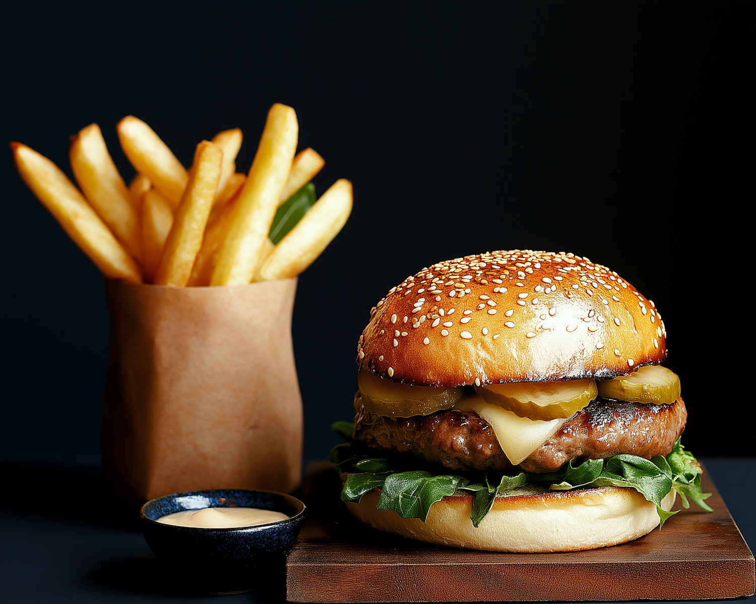 Juicy burger with melted cheese, pickles, and arugula on a sesame bun, served with golden fries and dipping sauce. Perfect comfort food!