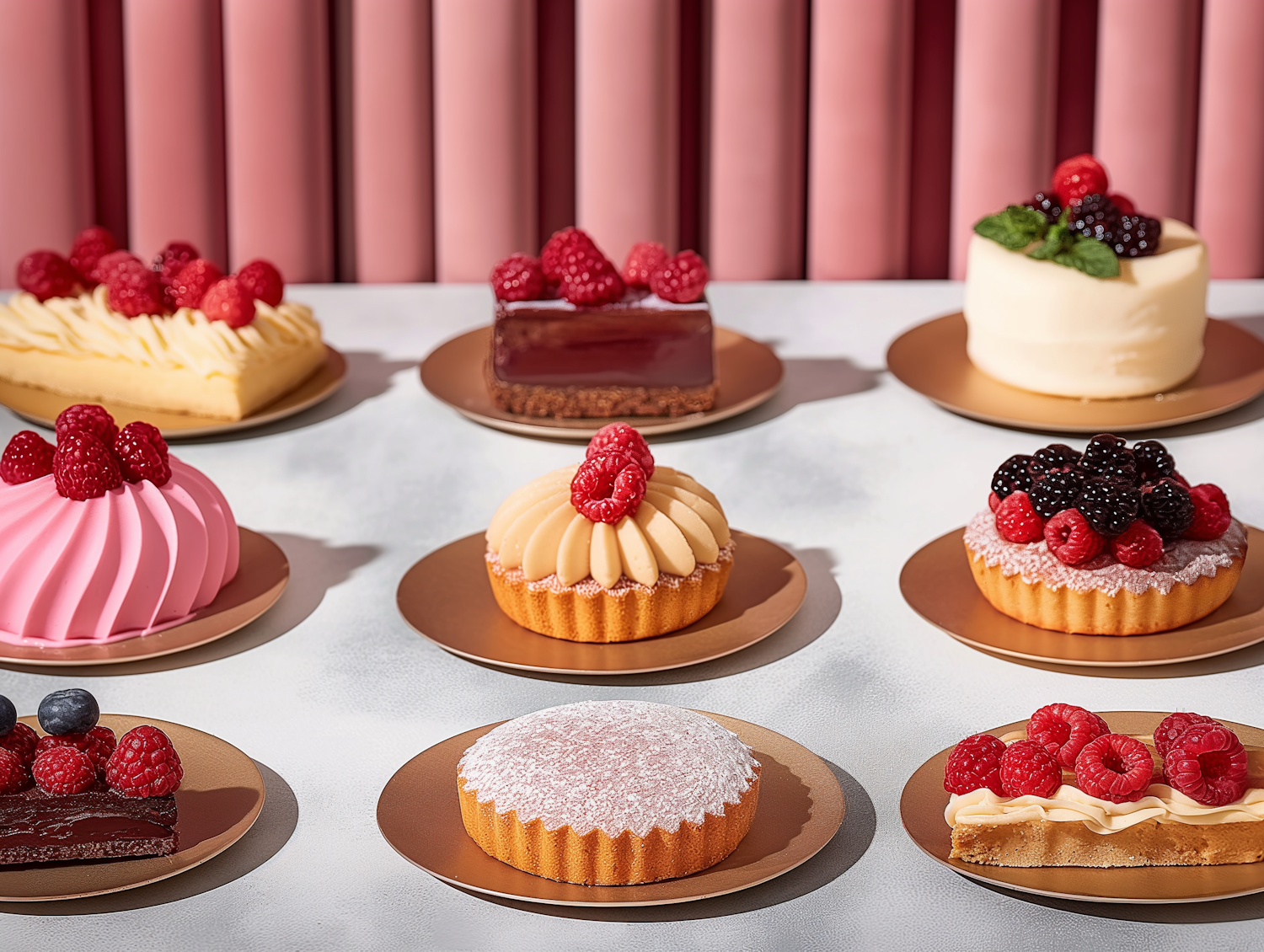 Assorted pastries with berries on golden plates, set against a pink backdrop. Vibrant colors and elegant presentation.