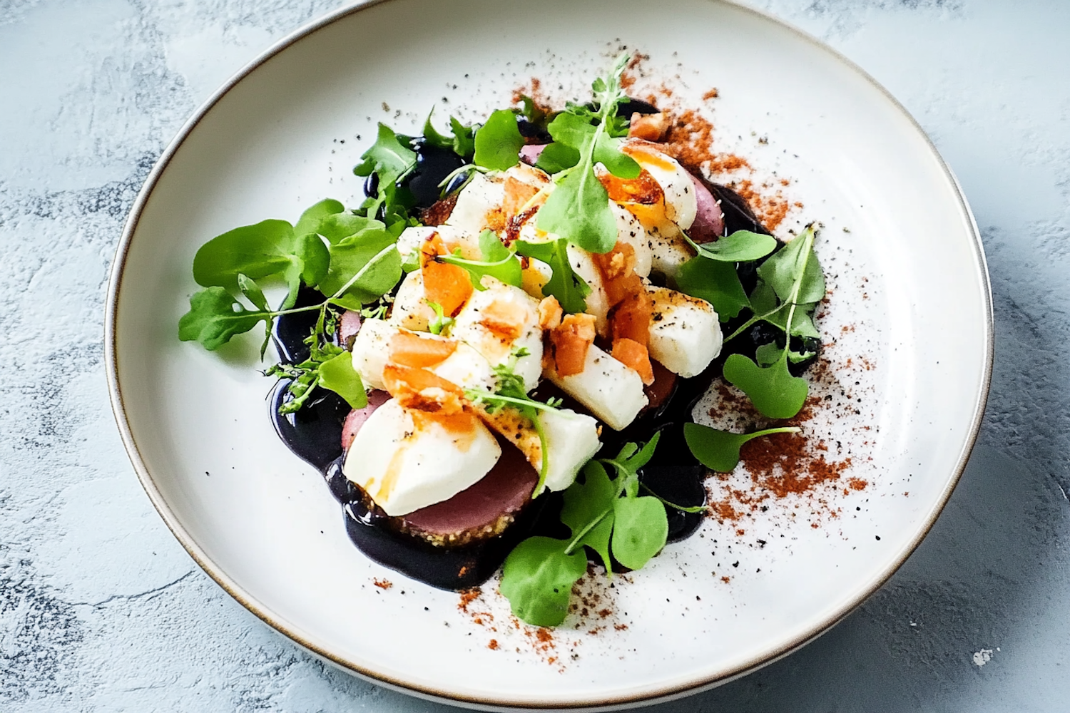 Gourmet dish with mozzarella, cured meat, balsamic glaze, microgreens, and paprika garnish on a white plate.