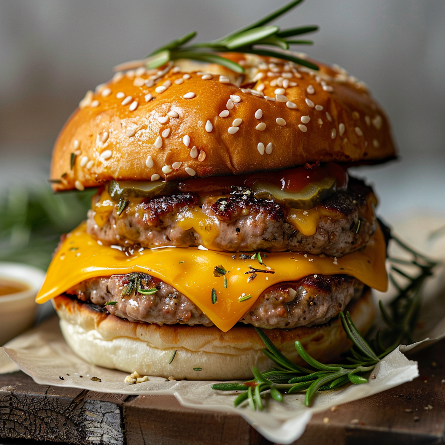 Delicious double cheeseburger with melted cheddar, pickles, and sesame bun, garnished with rosemary on a rustic wooden surface.