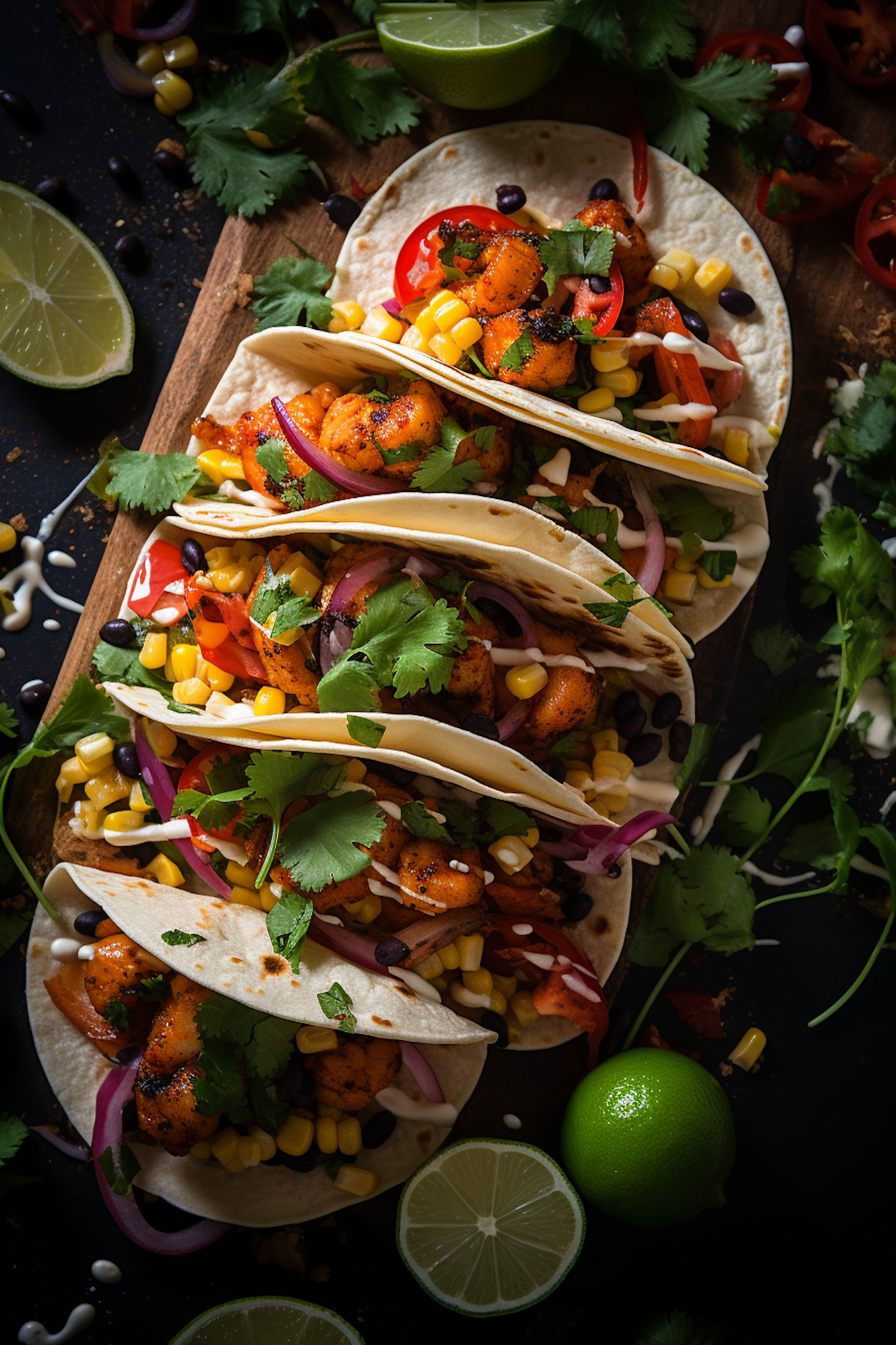Delicious shrimp tacos with corn, black beans, and cilantro on a wooden board, garnished with lime and creamy sauce.