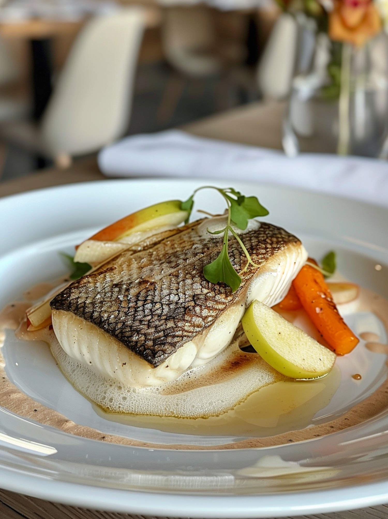 Gourmet dish of grilled fish with crispy skin, green apple slices, and roasted carrots on a white plate in a refined dining setting.