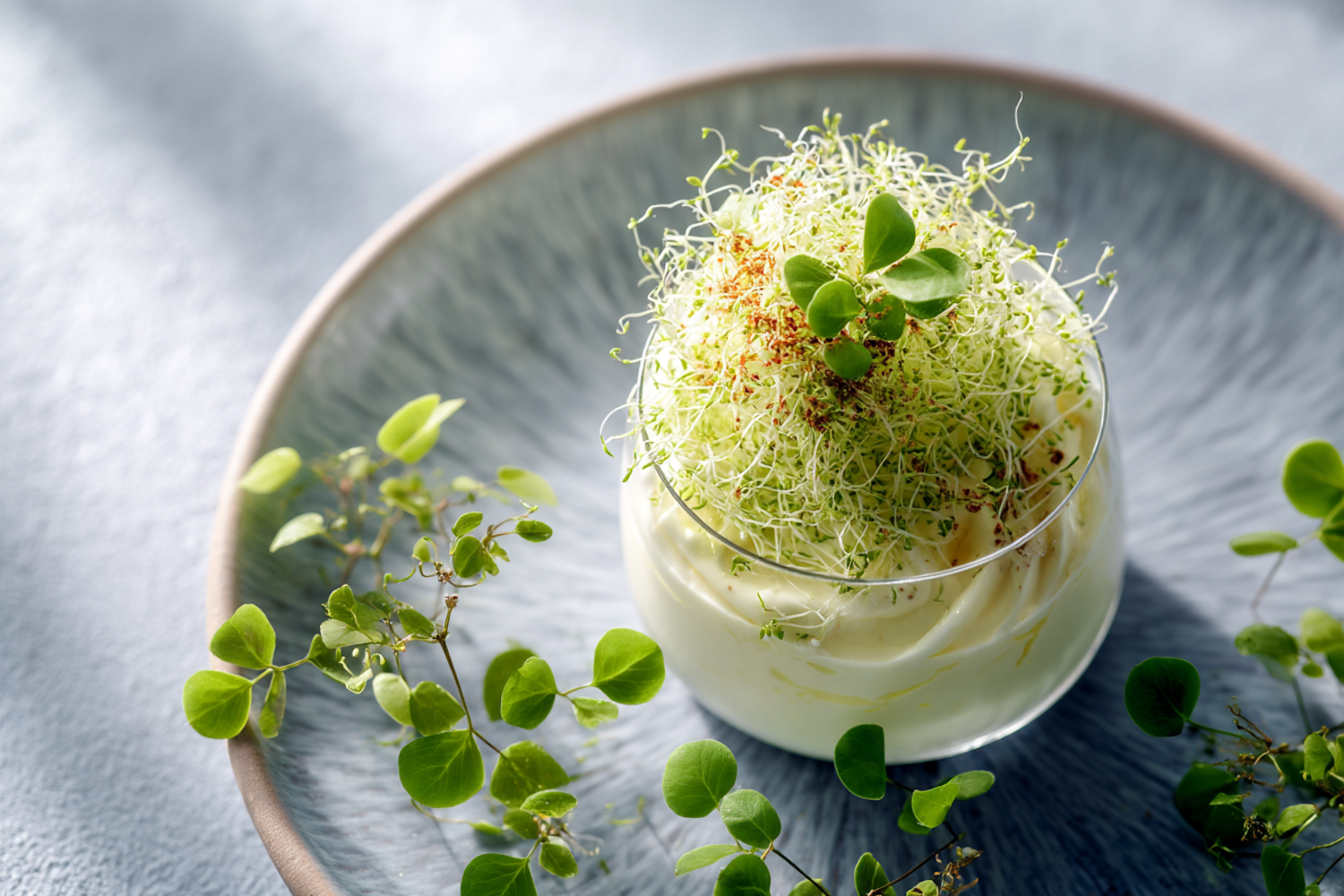 A beautifully plated creamy mousse dessert garnished with fresh sprouts and microgreens, styled on a textured blue plate.
