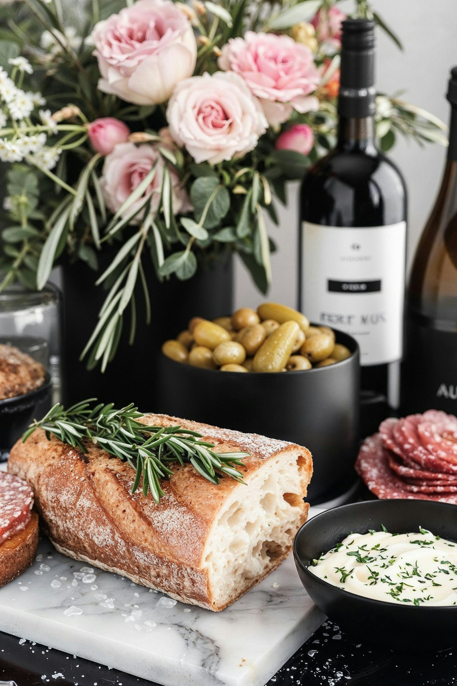 Elegant food scene with bread, rosemary, olives, cured meats, and wine, accented by pink roses. Perfect for a gourmet dining experience.
