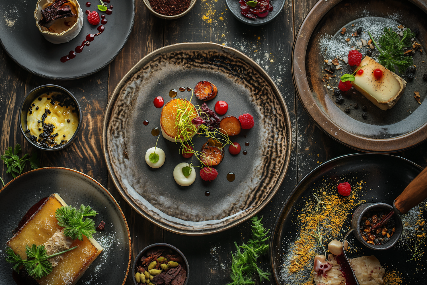 Gourmet dishes artfully arranged on a dark wooden table, featuring vibrant vegetables, desserts, and cheese plates with elegant garnishes.