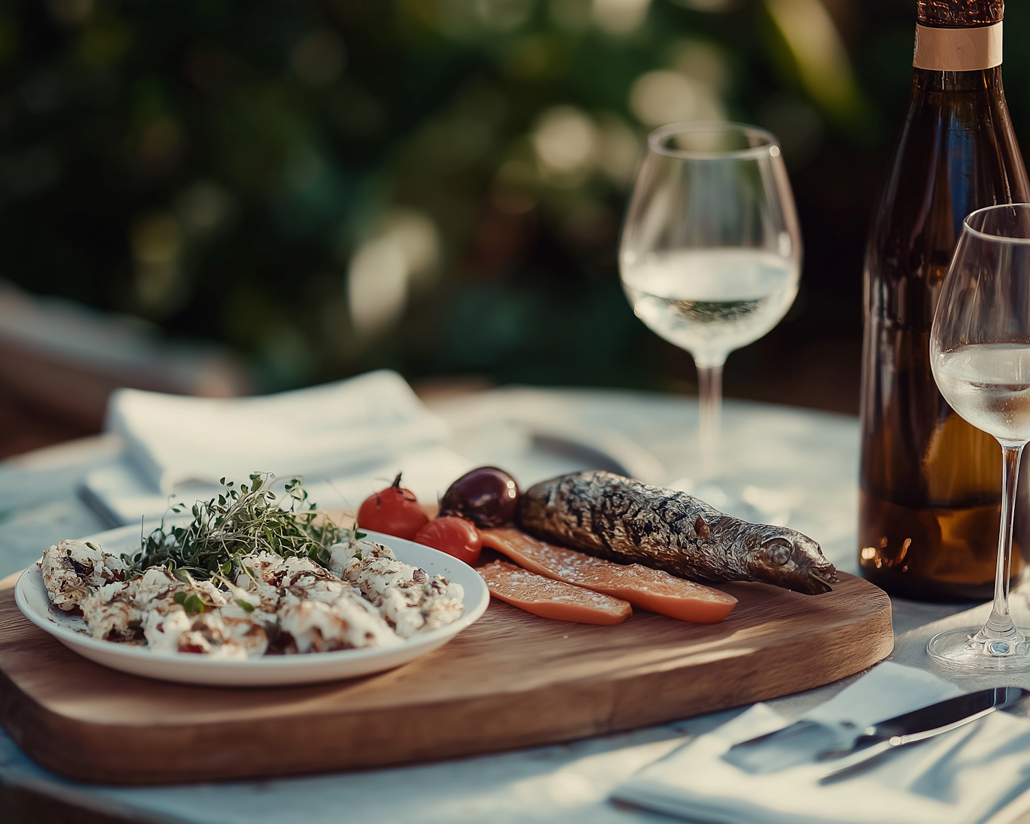 Elegant outdoor dining setup with grilled fish, fresh greens, and white wine on a wooden board.