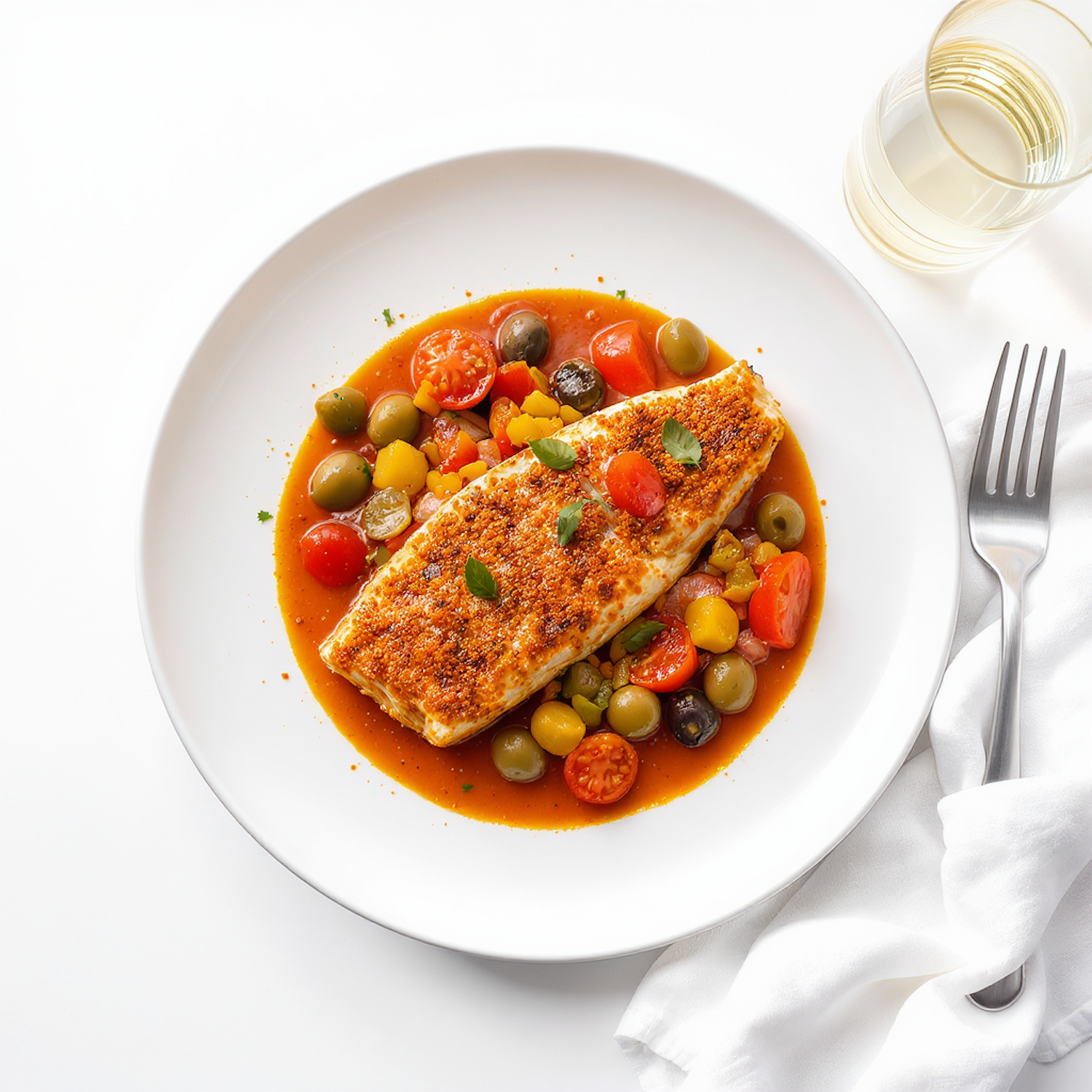 Seared fish fillet with a tomato-based sauce, olives, and cherry tomatoes, served elegantly with a glass of white wine.