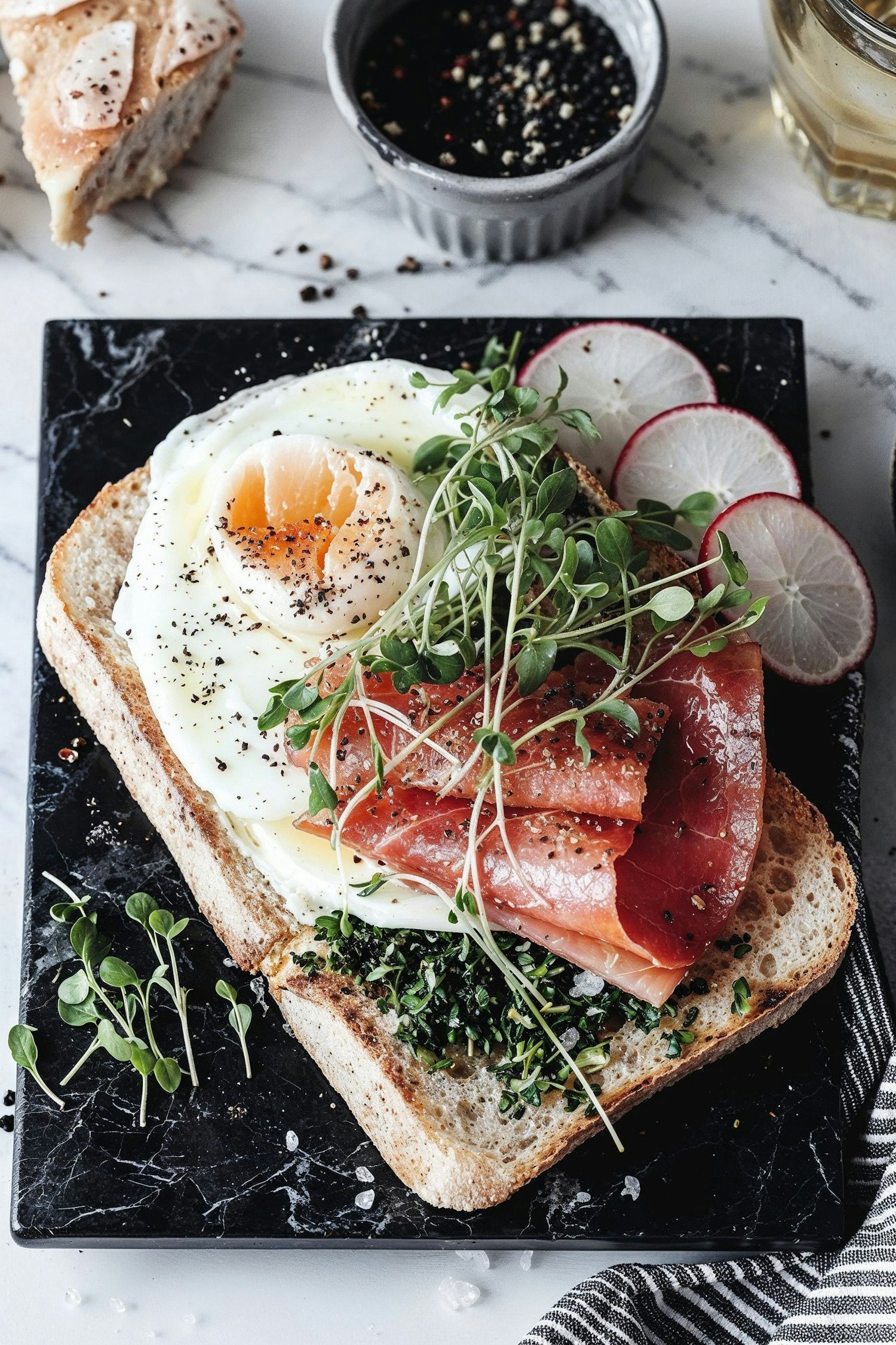 Gourmet open-faced sandwich with poached egg, prosciutto, microgreens, and radishes on rustic bread. Perfect for a stylish brunch.