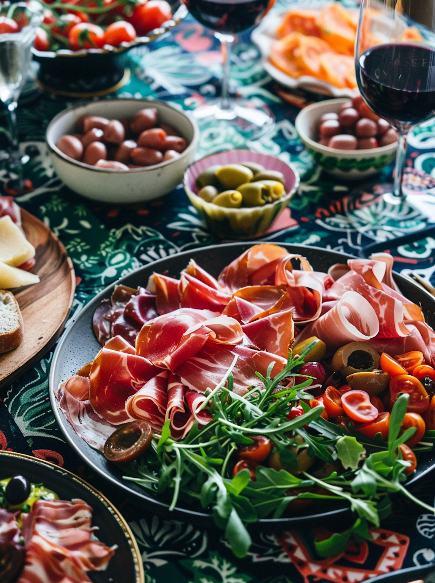 A colorful charcuterie spread with cured meats, olives, and wine on a patterned tablecloth, perfect for a festive gathering.