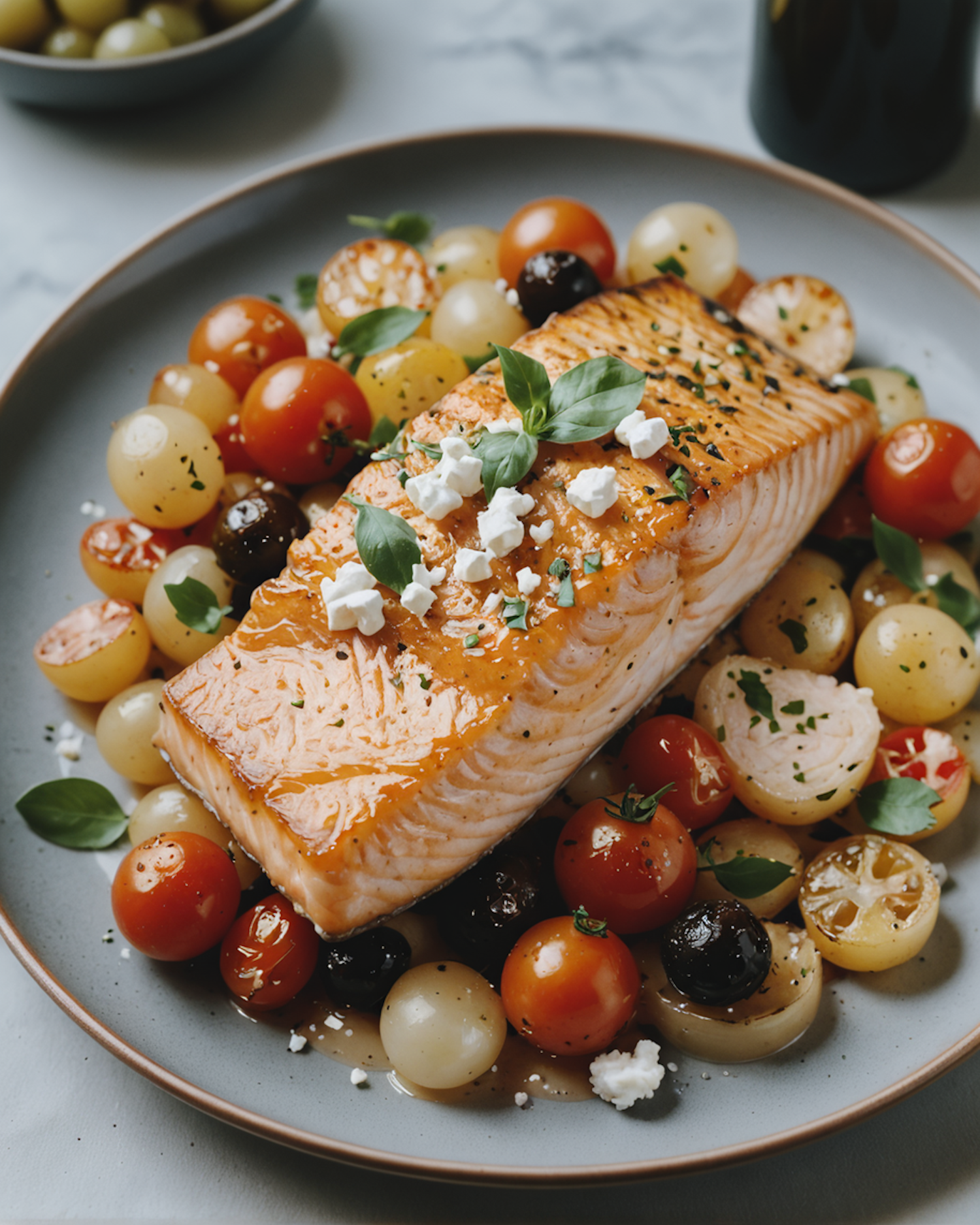 Delicious salmon fillet with cherry tomatoes, olives, basil, and feta on a gray plate. Vibrant colors and fresh ingredients.