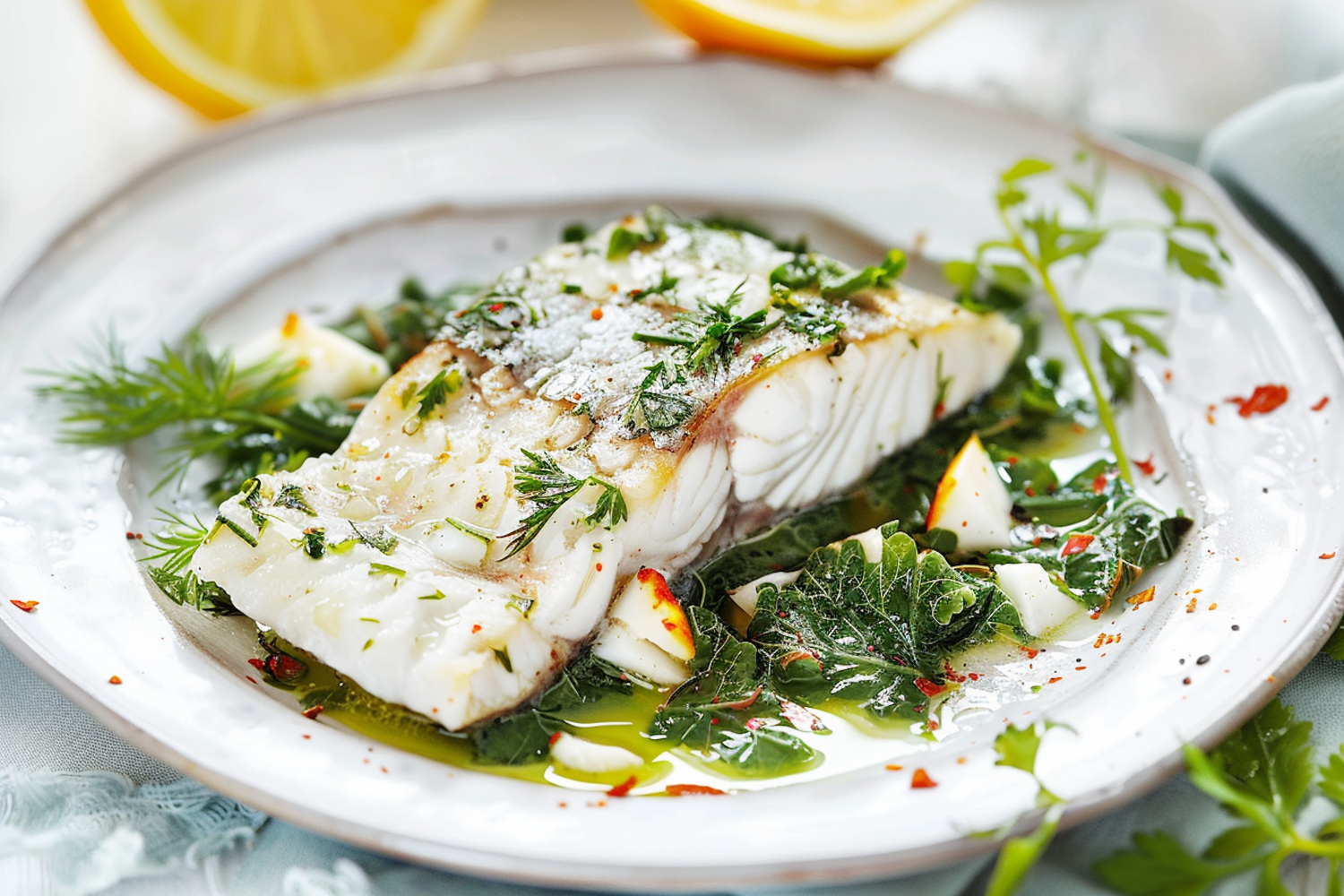 Delicious white fish fillet with fresh herbs, olive oil, and lemon, garnished with greens and red pepper flakes for a flavorful dish.